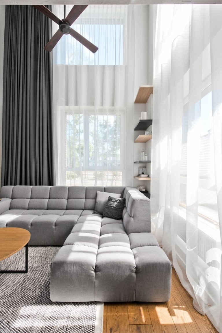 Interiér si lze nejlépe prohlédnout ze schodů stoupajících z obývací zóny směrem do ložnice. Pozornosti návštěvníků tak neunikne zajímavě řešené posezení na širokých parapetech doplněných dřevěným obložením topných těles. Požitek z odpočinku umocňují pohodlné polštářky, blízký krb i výhledy do zahrady. Nejenže je tak v celém prostoru zajištěn dostatek klidu, světla, tepla a pohodlí, není tu nouze ani o inspiraci, kterou poskytuje svěží dotek přírody.