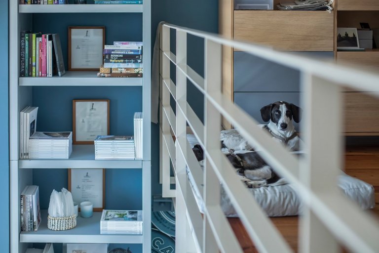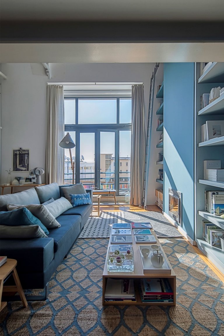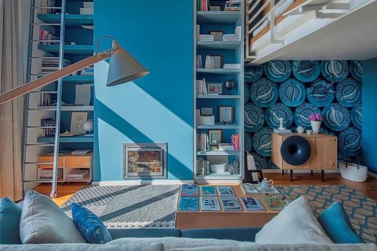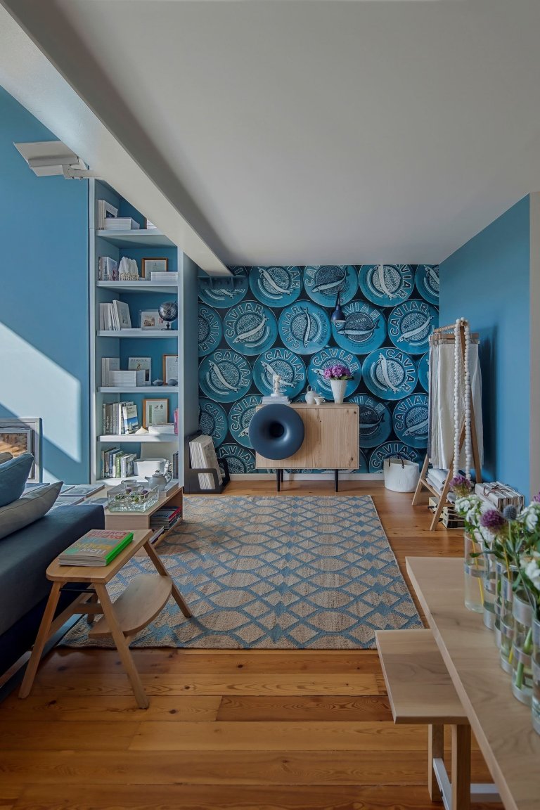 V pozadí modré barvy se ztrácí zejména obývací pokoj. Do modré jsou tu utopené police i zdi netradičně zdobené tapetou s motivy plechovek od kaviáru. Modrá barva dostává prostor také na žebříku usnadňujícímu přístup do nejvyšších pater knihovny, ale i na sedací soupravě, koberci a řadě bytových doplňků. Stejně příjemné odstíny modré barvy lemují i rámy balkonových oken. Jakmile se do nich opře slunce a interiér zaplaví hřejivé teplo, efekt přímořské atmosféry a letních dnů se stane dokonalým.