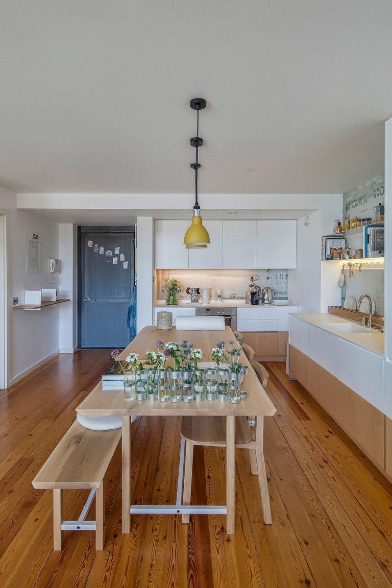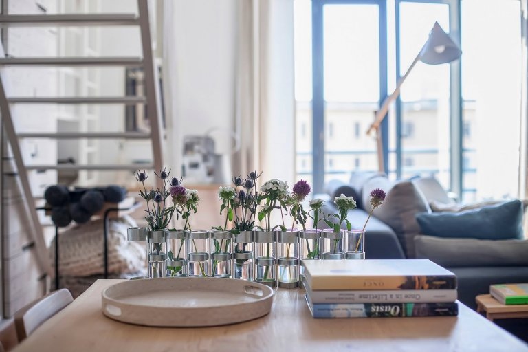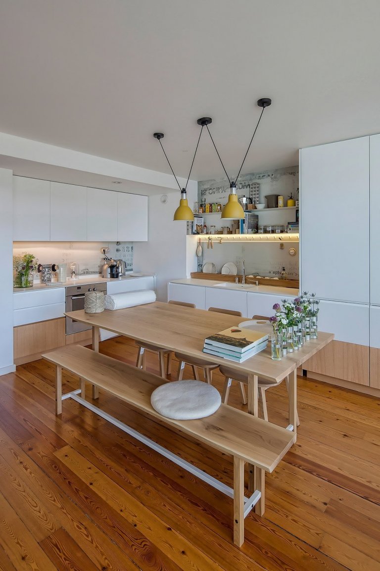Srdcem podkrovního bytu je obývací pokoj s vysoce komfortní sedací soupravou, na nějž navazuje jídelní prostor tvořený velkým jídelním stolem, který namísto židlí doplňují lavice. Příjemné žluté akcenty představují dvě závěsná svítidla snášející se nad jídelní stůl. K dotvoření půvabné atmosféry pak nemohou chybět ani řezané květiny v designových vázách. Kuchyně je skromnější, ale dostačující. Na kuchyňskou linku navazují další úložné prostory, které lemují i výstup po schodišti do pracovny v patře. Půvab interiéru přitom umocňuje bíle lakovaný dřevěný nábytek, ale i ten zanechaný v původní přirozené kráse a se zajímavou texturou. S tím pak příhodně ladí dřevěné podlahy, které sem tam pokrývají koberce s nádechem modré barvy.