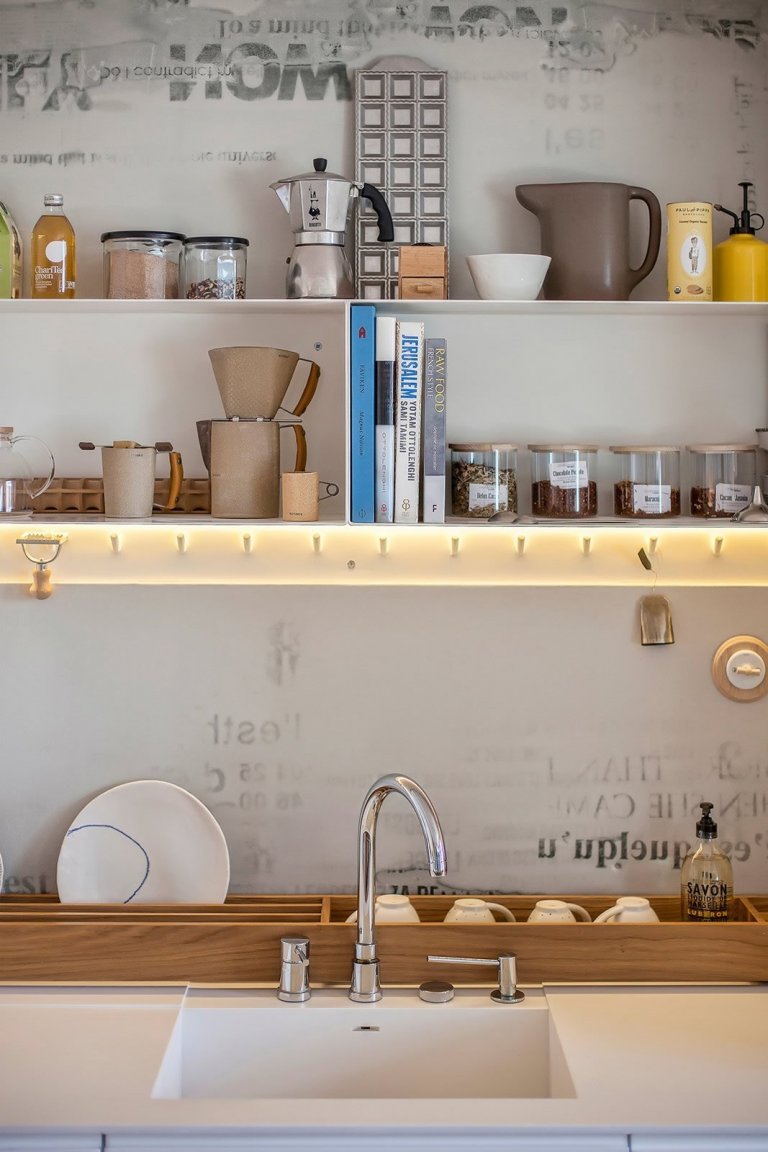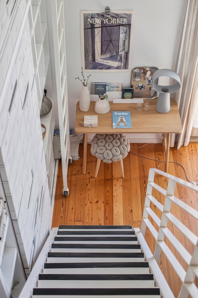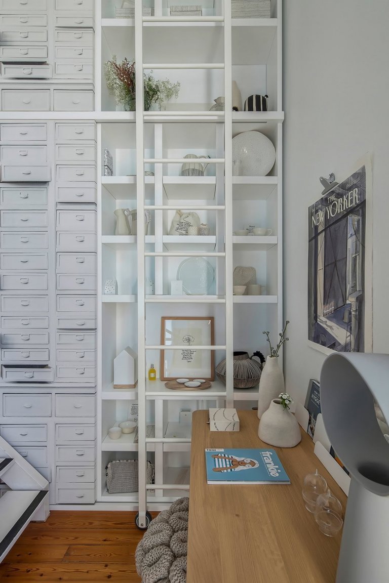 Co se týče jednotlivých místností dvoupodlažního podkrovního bytu, ve spodním patře se nachází menší kuchyně s jídelnou, prostorný obývací pokoj a koupelna. Na galerii, která je přístupná po schodech, vzniklo místo pro velkoryse pojatou pracovnu. Úložné prostory jsou řešeny pomocí vestavěných skříní, které sahají až do stropu. Neubírají tak interiéru na vzdušnosti ani na prostoru. Úložné prostory v obývacím pokoji nabízí i originální konferenční stolek a další stolky a komody citlivě rozmístěné po místnosti. Celek tak vůbec nepůsobí zahlceně a přináší majitelce to pravé místo pro práci i odpočinek, při němž má všechno důležité po ruce.
