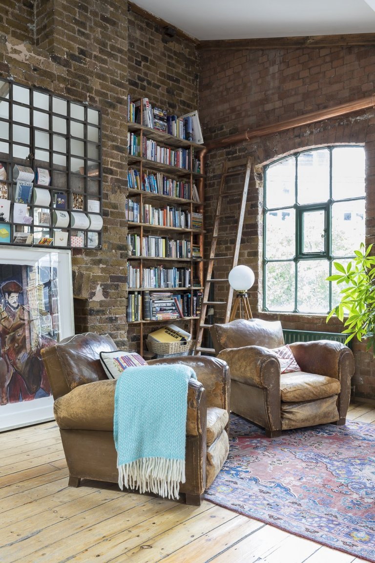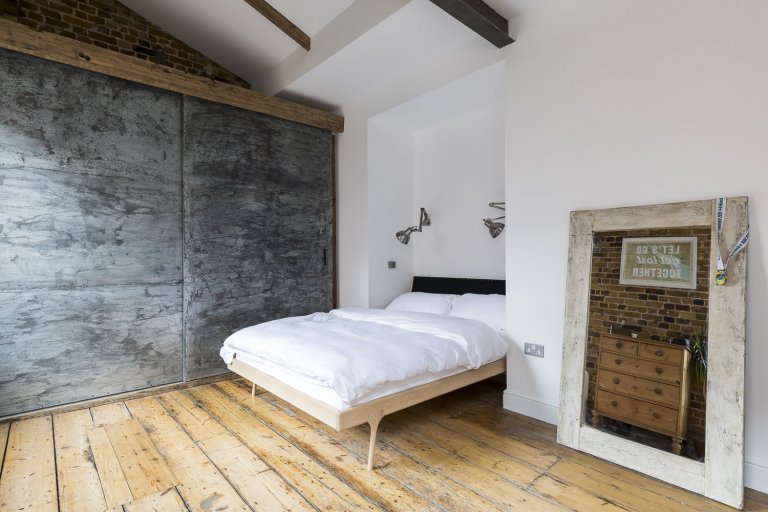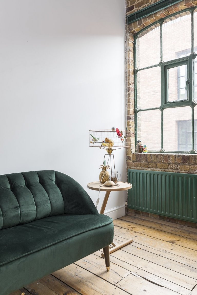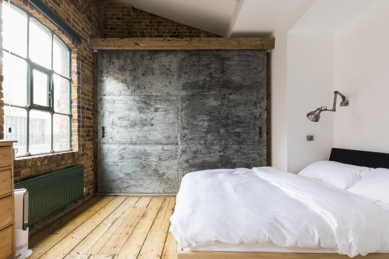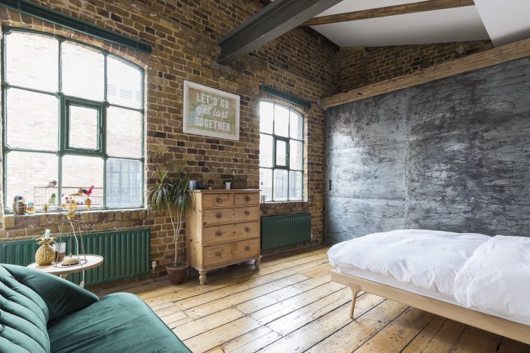 Podíváme se do Londýnské čtvrti Shoreditch, kde byl jeden takový průmyslový loft vytvořen. Pod křídla si objekt vzala společnost HouseUP a navrhla jeho kompletní rekonstrukci. Původní cihly i okna byly zachovány a repasovány. Stejně tak originální prkenná podlaha, která odráží historii tohoto místa. Kromě výrazné cihlové zdi, dominující celému prostoru, je zbytek zdí vymalován na bílo. Přiznané ocelové traverzy horizontálně oddělují prostor obývacího pokoje a kuchyně. V interiéru se také často opakuje použití masivního dřeva. Modrá sedačka, zelená průmyslová svítidla a mnoho kovových zařizovacích prvků. Vše je sladěno do posledního detailu. Industriální ráz se tomuto místu nezapře. Bronzové trubky na poličkách, baterie v kuchyni, nebo efektní žebřík na zavěšení ručníků zavěšený v koupelně. Cit pro detail je vidět na každém kroku. V koupelně použitá betonová stěrka působí čistě. Zvolené kachle s retro vzorem ve sprše tak díky malbě spíše vyniknou. Barevně i funkčně je celý interiér dotažen k dokonalosti a milovníci industry zde budou zajisté spokojeni.