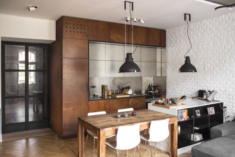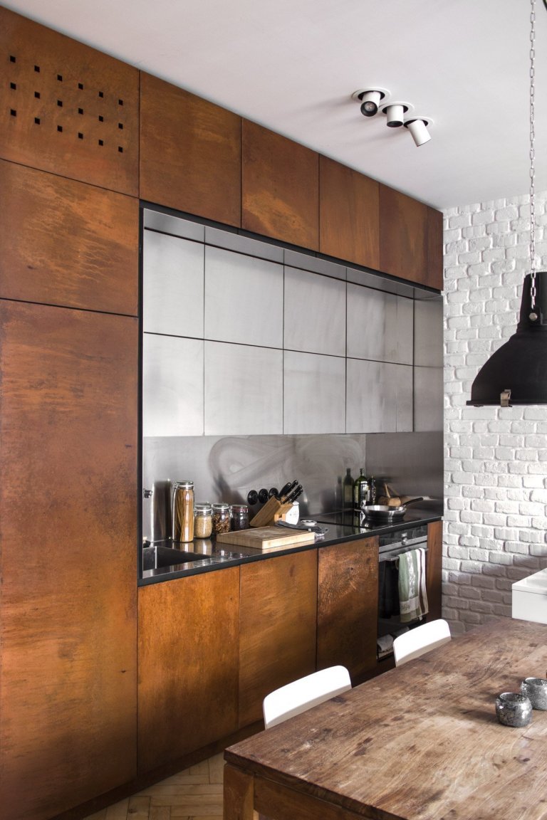 Budoucí obyvatelé si přáli praktický, světlý a nevšední byt, který by se lišil od zažité formy. Nebáli se experimentovat, a tak byli z kombinace industriálního stylu s původními prvky nadšení. Architekti tedy zachovali některé ze stávajících prvků včetně pohledového zdiva a terazza u vstupu, do nichž vložili trochu industriálního rázu. Měli štěstí v tom, že majitelé nebyli, co se týče pojetí interiéru, příliš konzervativní. Architekti si tak mohli například dovolit obložit kuchyni i koupelnu rezavým plechem. Mladý pár byl rovněž zaujat myšlenkou kompletně nerezového pracovního prostoru. Plech byl přitom uzavřen matným lakem, aby nešpinil. V interiéru se neobjevuje pouze jako obklad stěn, ale rovněž jako obklad kuchyňských dvířek, dveří do koupelny či výplň kliky těchto dveří. Originálním prvkem v kuchyni je také bezešvý dřez, který mohl vzniknout právě díky použití nerezové oceli. Tento specifický kuchyňský dřez je přímo zavařený a zabroušený do pracovní desky.