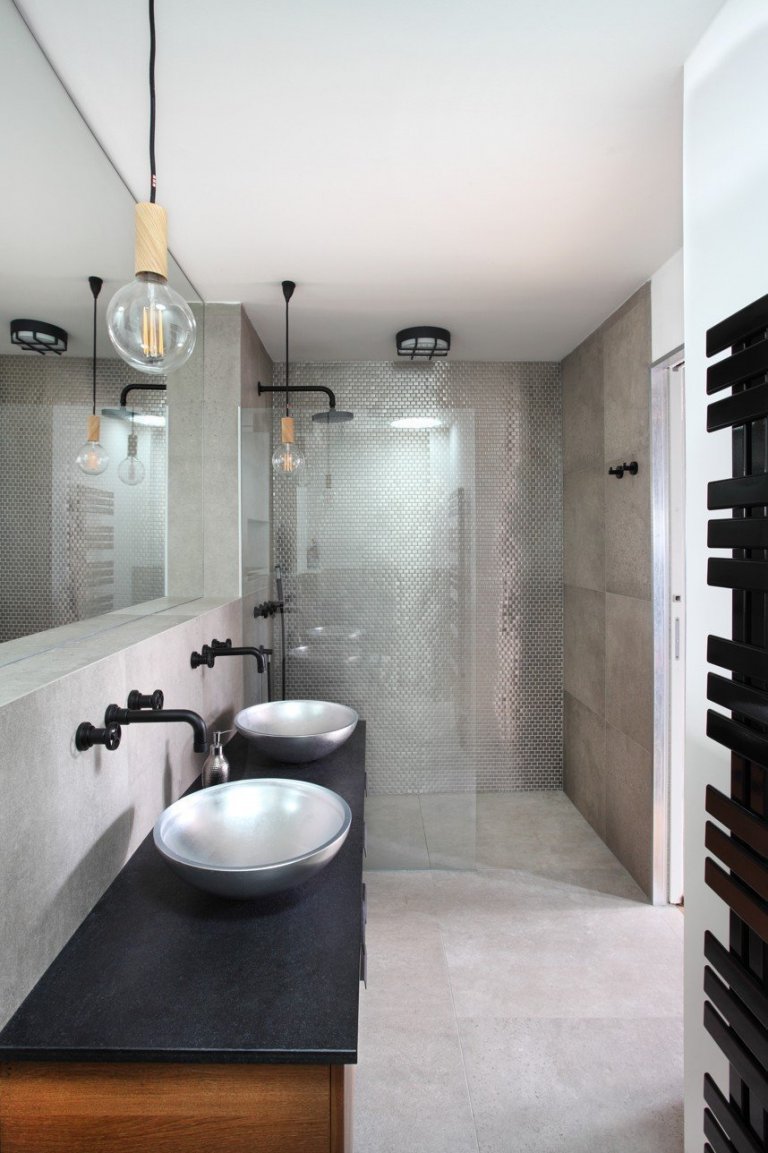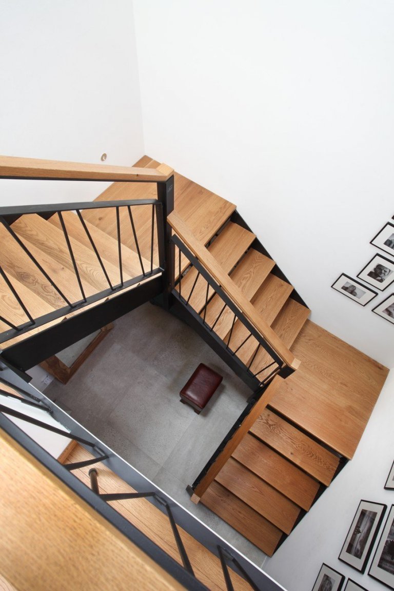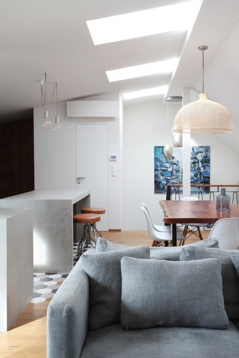 Monika White si kromě celého konceptu a návrhů vzala na starost nejen komunikaci se skupinami odborných řemesel, ale i se stavební firmou developera. Její partner výsledný layout překreslil tak, že oproti původnímu projektu získala nové místo ložnice a kuchyně. Podle jeho návrhu vznikly v interiéru půdního bytu nové schody, jejichž zajímavostí je, že se vlastně jedná o samostatnou kovovou konstrukci zavěšenou do zdi. Společně se pak postarali o kompletní realizaci včetně dodávek podlah, dveří, koupelen či kuchyně. Samonosné schodiště však není v tomto bytě jedinou zajímavostí. Byt o rozměrech 155 m2, který je koncipován jako dvoupodlažní s terasou, byl totiž doplněn o světlovody, s jejichž pomocí se světlo dostalo až do koupelny. Celkově se tedy podařilo vytvořit pro majitele příjemně světlý půdní byt, do kterého proniká dostatek „horního“ světla. Atmosféra v bytě tak odpovídá tomu, jaká světelná hladina je za oknem. Díky takovému světelnému komfortu mají majitelé zaručen příjemný život včetně rychlého usínání a kvalitního spánku.