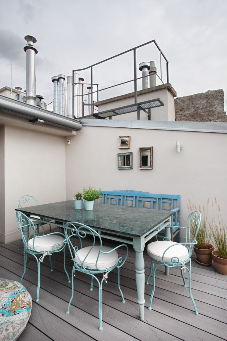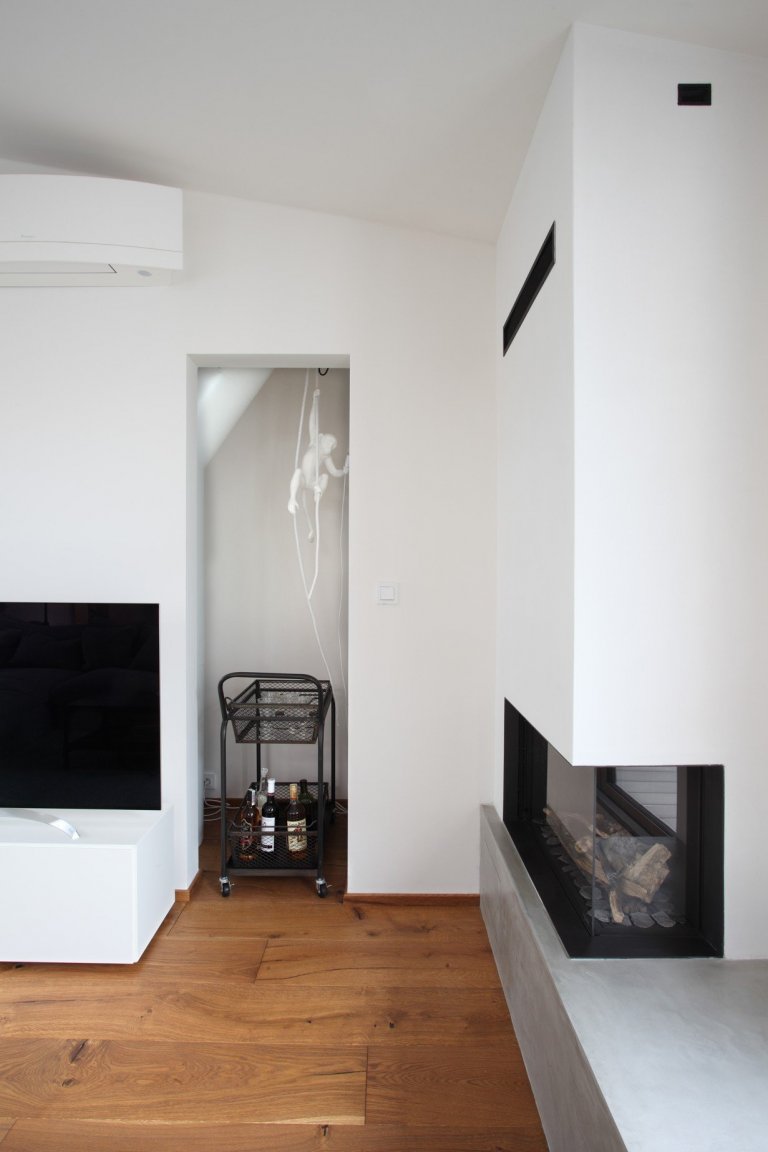 Jelikož se inspirací pro tuto realizaci stal styl newyorského loftu, celým interiérem prochází beton, dubové dřevo a kovové prvky. Přírodní materiály se zde zajímavě doplňují s lehce industriálním nádechem. O originalitu bydlení se vedle této příjemné symbiózy starají i designové kusy nábytku. K těm patří zejména masivní jídelní stůl dovezený z Indie či toaletní stolek ve vintage stylu v ložnici. Netradičně řešená je také podlaha v obytném prostoru, seskládaná z geometrických dlaždic, které se jakoby vlévají do dřevěné části. Zájmu hostů jistě neujde ani zajímavě koncipovaná kuchyň, která je originálem vyrobeným na míru z masivního dřeva, hrubého kovu a betonové stěrky. Za povšimnutí stojí rovněž šatna z kombinace dřeva a kovu, která se otevírá do ložnice, či půvabná terasa. Výsledkem je tedy mimořádně stylové bydlení v decentně industriálním stylu. Ten umocňuje přiznaný cihlový komín, který spolu s dalšími obdobnými prvky evokuje populární loftové bydlení.