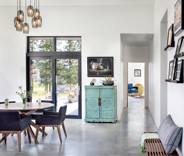 Velká okna dovnitř přinášejí dramatické obrazy čarokrásné krajiny. Prioritou celého bydlení přitom byla udržitelnost, komfort a právě propojení interiéru s exteriérem. Důkazem toho je mimo jiné otevřený a vzdušný obývací pokoj s velkými okny, kterými lze pozorovat romantický západ slunce i toulání jelenů. Charlie Deese, projektový architekt rezidence, dobře věděl, na jaké přírodní krásy má nasměřovat pohled obyvatel a jejich hostů, a podle toho je celý dům koncipován. Architekt mimo jiné vytvořil praktický a estetický výklenek pro okno a dveře směřující na prostornou terasu. Také jedna ze stěn v hudební místnosti je nakloněna, i když v tomto případě tak bylo učiněno spíše kvůli akustice.