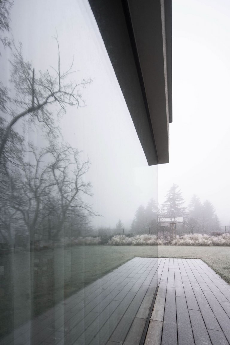 Konstrukční systém sestává ze zděných stěn z pálených cihel a monolitických stropních desek. Obvodové konstrukce jsou doplněny o hliníková okna a velké prosklené plochy. Část ploché střechy na sebe vzala funkci pochozí terasy s dřevěnou podlahou. Co se týče použitých materiálů, velkou roli zde hraje pohledový beton, strukturovaná fasádní omítka a bílá interiérová omítka. Tento monochromatický vzhled je osvěžen dřevěnými podlahami a nerezovými sítěmi. Poněkud stroze vyhlížející vstupní část domu je vizuálně změkčena dřevěným obkladem, který se objevuje i na podhledu garážového přístřešku.