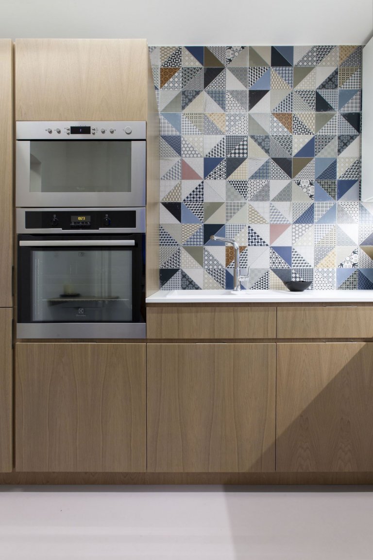 Vestavěný nábytek s dřevěným obkladem plynule propojuje prostory denní části, od vstupu do bytu až po kuchyni. Dominantním prvkem v interiéru je vložen dřevěný nábytkový kubus, který skrývá vše nutné pro obsluhu a fungování bytu. Tento prvek se stal směrodatný pro celkový design bytu.