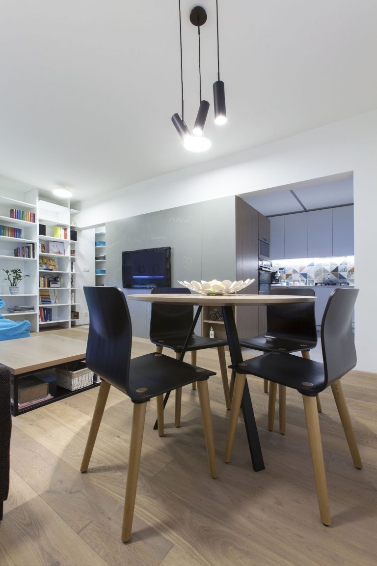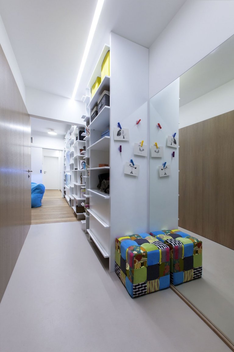 Byt se snaží přiblížit i nejmladším členem rodiny. Stěna s TV je umožňuje dětem kreslení po stěně. Jednoduché členění spolu s přirozeným osvětlením dodává bytu větší vzdušnost, která je pro Stěžejním chovné prostory denní části velmi důležitá. Otevřený policový systém podtrhuje čisté řešení bytu.