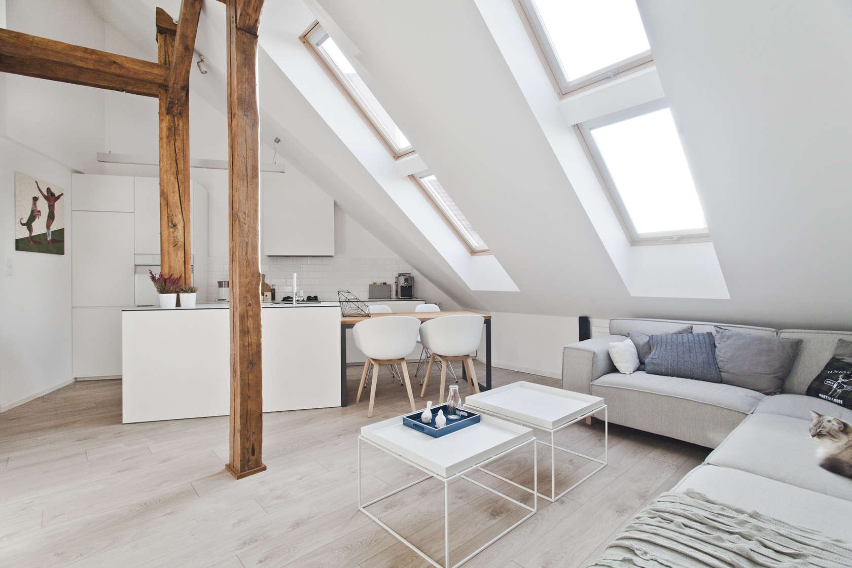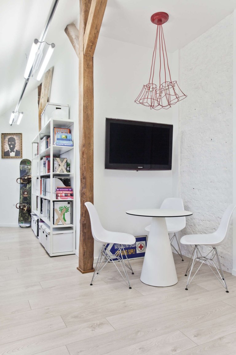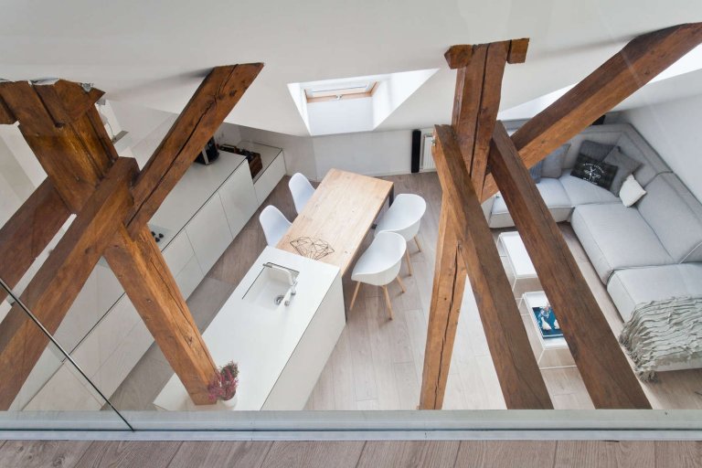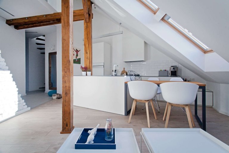 Majitel měl od počátku zájem zachovat co nejvíce původních prvků a vytvořit jedinečný genius loci podkroví. S dřevěnými trámy koresponduje jídelní stůl, který doplňuje minimalistickou bílou kuchyň. Kuchyň je přímo propojená s obývacím pokojem, chodbou a schodištěm, které vede na poschodí řešené formou galerie, kde najdeme další obytné a pracovní prostory, konkrétně ložnici a ateliér/pracovnu.