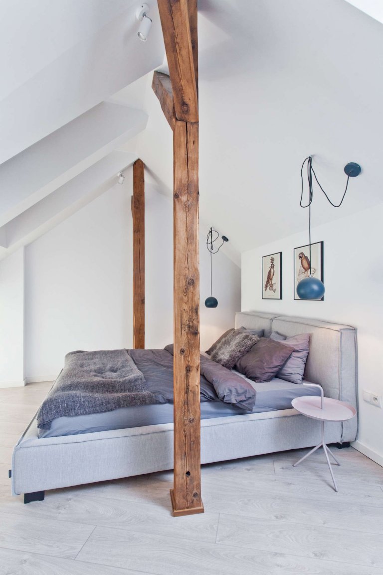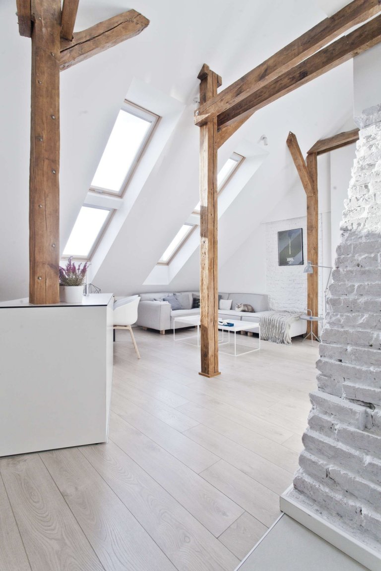 Opticky se podkroví zdá být ještě větší než ve skutečnosti je (80 m²), protože velká část povrchů je natřená sněhobílou omítkou. Části původních cihlových příček byly zachovány i s originální strukturou, avšak pro sjednocení dojmu byly také natřeny na bílo. Výrazným prvkem, který vertikálně i horizontálně předěluje prostor a dodává mu příznačnou jedinečnost podkrovního bydlení, jsou přiznané trámy v jejich naturální podobě – nahé dřevo ošetřené prostředky na zachování jeho kvality.