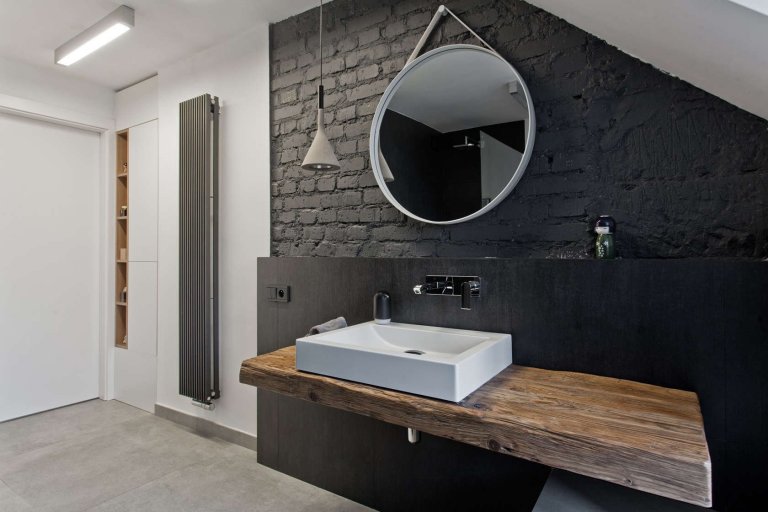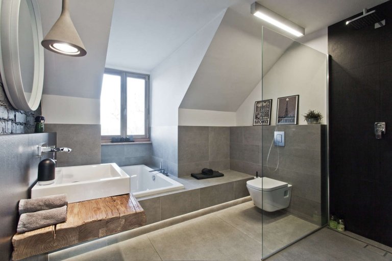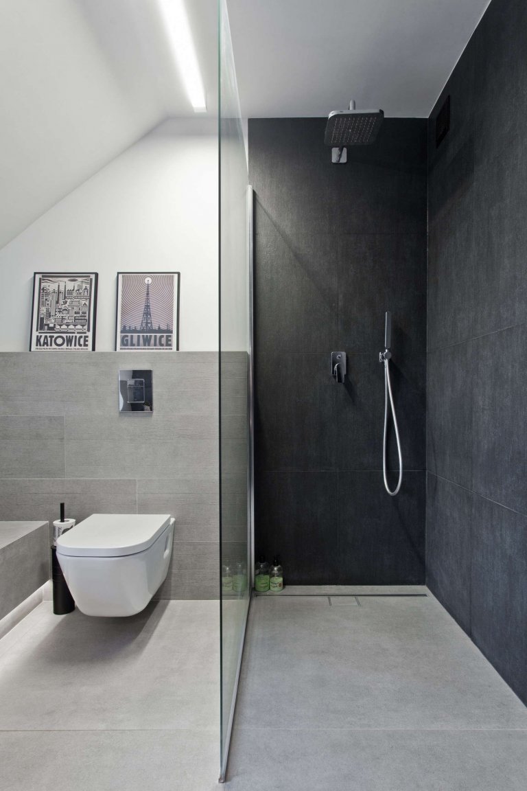 Kromě kuchyně a obýváku najdeme v "přízemí" i prostornou a elegantní koupelnu, v níž – kontrastně ke zbytku obydlí – najdeme hlavně šedé i černé povrchy.