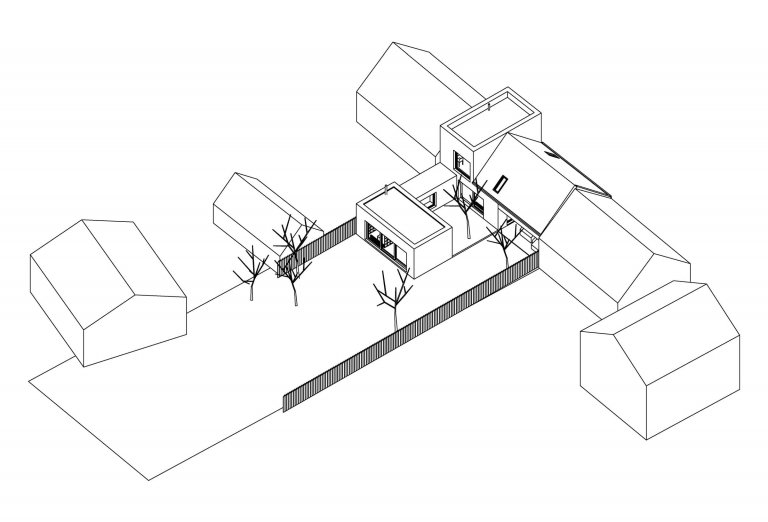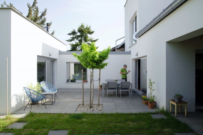 Původní uliční zástavbu tak osvěžil netradičně řešený dům, který však na sebe zbytečně nestrhává pozornost. Příjemnou kombinací bílé omítky, šedých okenních rámů a dřevěných prvků přirozeně zapadá do kontextu tohoto místa. Je zajímavou ukázkou současné estetiky, která čerpá z odkazu původního stavení.