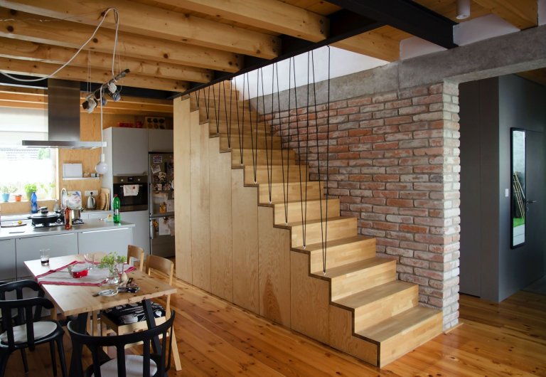 Podkroví domu nově doplnila kubická hmota studovny a herny, která se otevírá směrem na jih i do zahrady. Proto, aby velikost domu příliš nevyčnívala, jsou dva malé pokoje a koupelna důmyslně skryty pod sedlovou střechou. Co se týče vybavení interiéru, k jeho zkrášlení byly vybrány materiály, které jsou pro ateliér TOITO typické. Vévodí mu tedy přírodní dřevo a překližka. Velice pěkný dojem přitom vytváří vestavěný nábytek, který kolikrát umně splývá s některými zdmi. Zajímavým prvkem jsou obnažené cihlové stěny, které příjemně prohřívají poněkud chladnější bílou výmalbu.