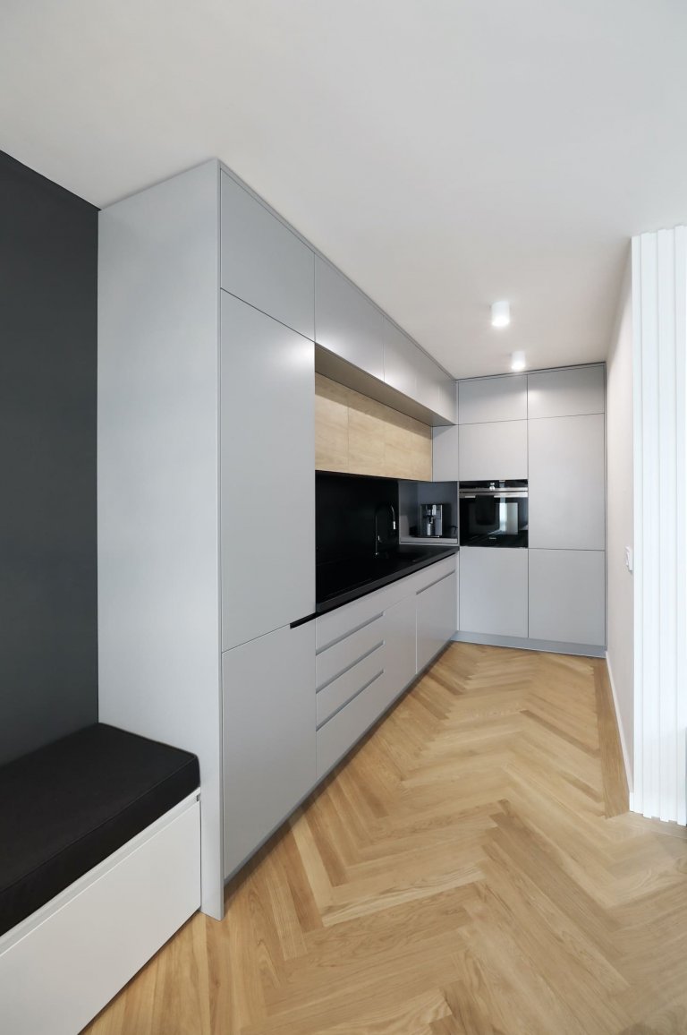 Kombinaci bílé, šedé a černé barvy v interiéru zjemňuje světlý odstín dřeva, který je patrný zejména na parketách. Právě jemné světlé tóny a dřevěné parkety patří mezi zásadní body, na kterých se majitelka a architekti shodli. Povrch podlahy tak náleží mezi další významné a v interiéru velmi dominantní prvky. Vzhledem k tomu, že důkladná rekonstrukce zahrnovala i výměnu všech rozvodů včetně podlahového topení, bylo nutné zvolit kompromis. Nejedná se tedy o masivní podlahu, ale o třívrstvé lamely, které jsou skládané tradičním stromečkovým způsobem.