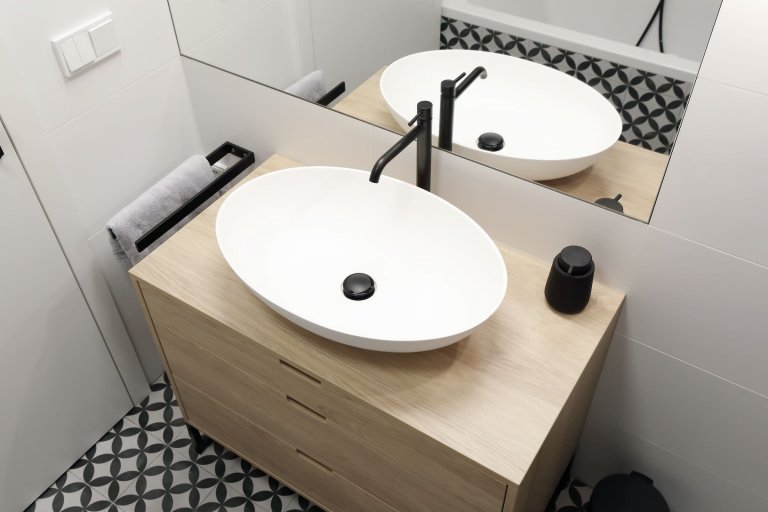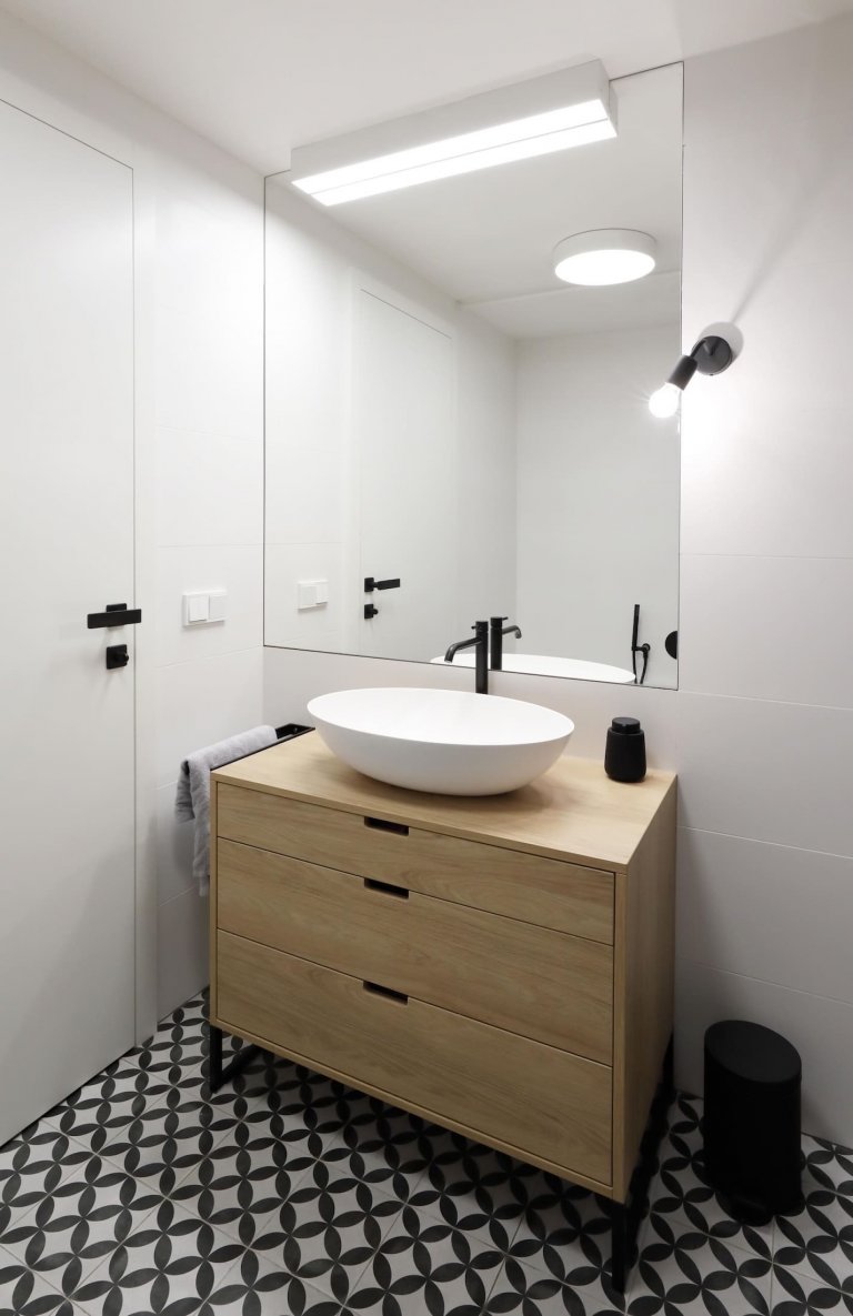 Významnou roli v interiéru hraje bílá barva. Dává o sobě vědět v případě sádrové omítky, obkladů či látky s tkanou strukturou. Šedá kuchyně tak na jejím pozadí velmi pěkně vynikne. Interiér přitom zajímavě dokresluje černá linka na všech kovových prvcích - na kohoutkách v koupelně, na podnoží stolu či na kovové lampě na stěně. Všechny prvky jsou přitom vyrobeny na míru, snad proto působí tak atypicky. Krásná truhlářská práce je patrná především u kuchyňské linky, vestavěných skříní či stolů. Z konstrukčního hlediska je v interiéru jistě nejzajímavější jídelní stůl. Není divu, že se posezení u něj stalo nejmilejším prostorem celého bytu, v němž rodina tráví většinu svého času.