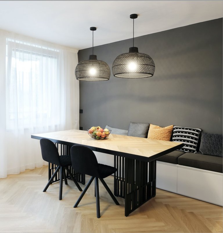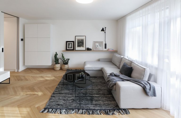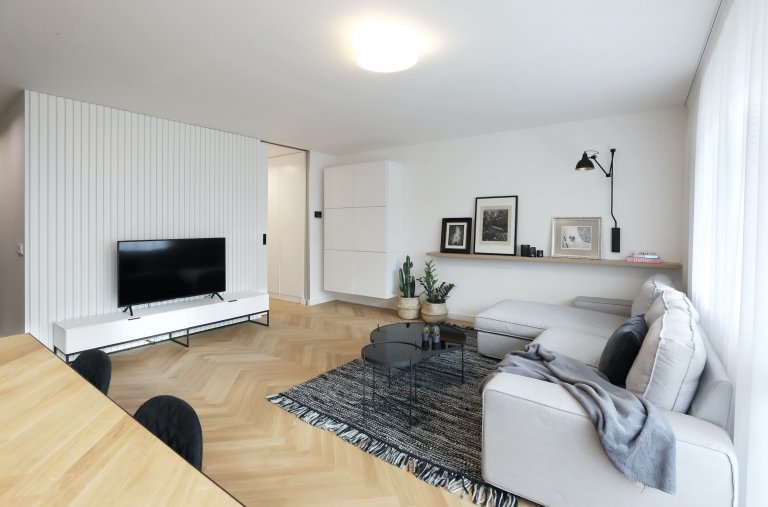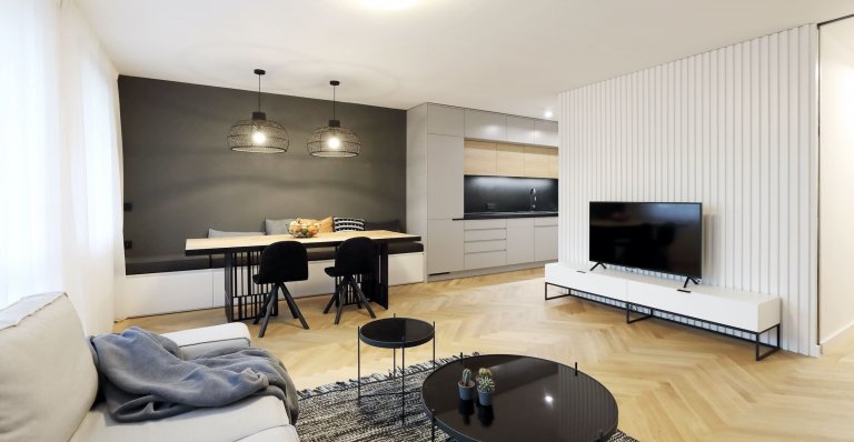 Rekonstrukcí vzniklo z malého panelového bytu stylové místo k bydlení, jedná se malý byt 3 + kk s rozlohou menší než 70 m²