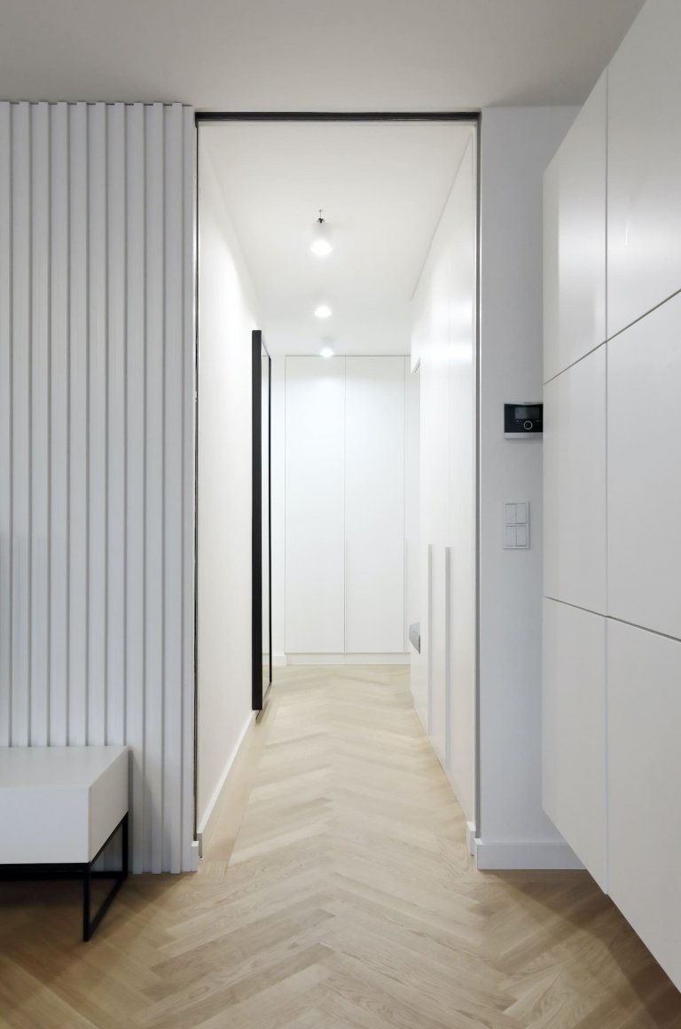 Pomyslným středobodem bytu je chodba, která jej rozděluje na dvě části. Obytnou část tvoří kuchyně propojená s obývacím pokojem a vstupem do předzahrádky. Odpočinková část sestává ze dvou pokojů. Koupelna je stejně jako toaleta velice úsporná, přesto zaujme svým zajímavým designem. Na to, že byt zaujímá plochu o velikosti 70 m2, nepůsobí vůbec stísněně. Stojí za tím chytře řešené úložné prostory, správná kombinace barev i čistý minimalistický styl.