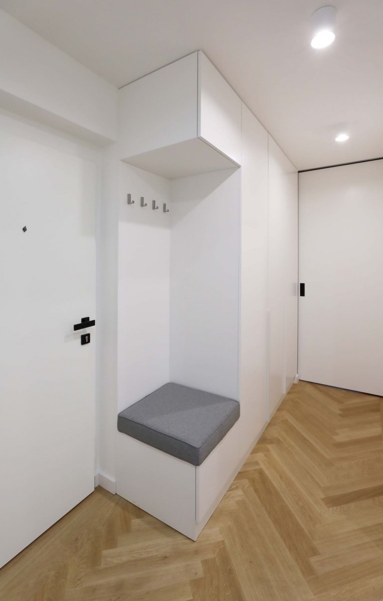 Už ve fázi poohlížení se po novém bytě byla mladá maminka v kontaktu s architektkou Alžbětou Vrabcovou a Robertem Martinčekem ze studia DMAE. Počítala totiž s tím, že se vybraný byt bude muset v případě nutnosti zrekonstruovat. Měla radost, když narazila na přízemní byt v panelovém domě. Moc si totiž přála, aby si v blízkosti svého bydlení mohla užít alespoň předzahrádku. A vůbec jí nevadilo, že je byt vcelku malý. Podélná dispozice se vstupem směřujícím doprostřed totiž velmi napomohla tomu, aby i malé místnosti bytu plně vynikly. Interiér tak působí neskutečně vzdušným dojmem.