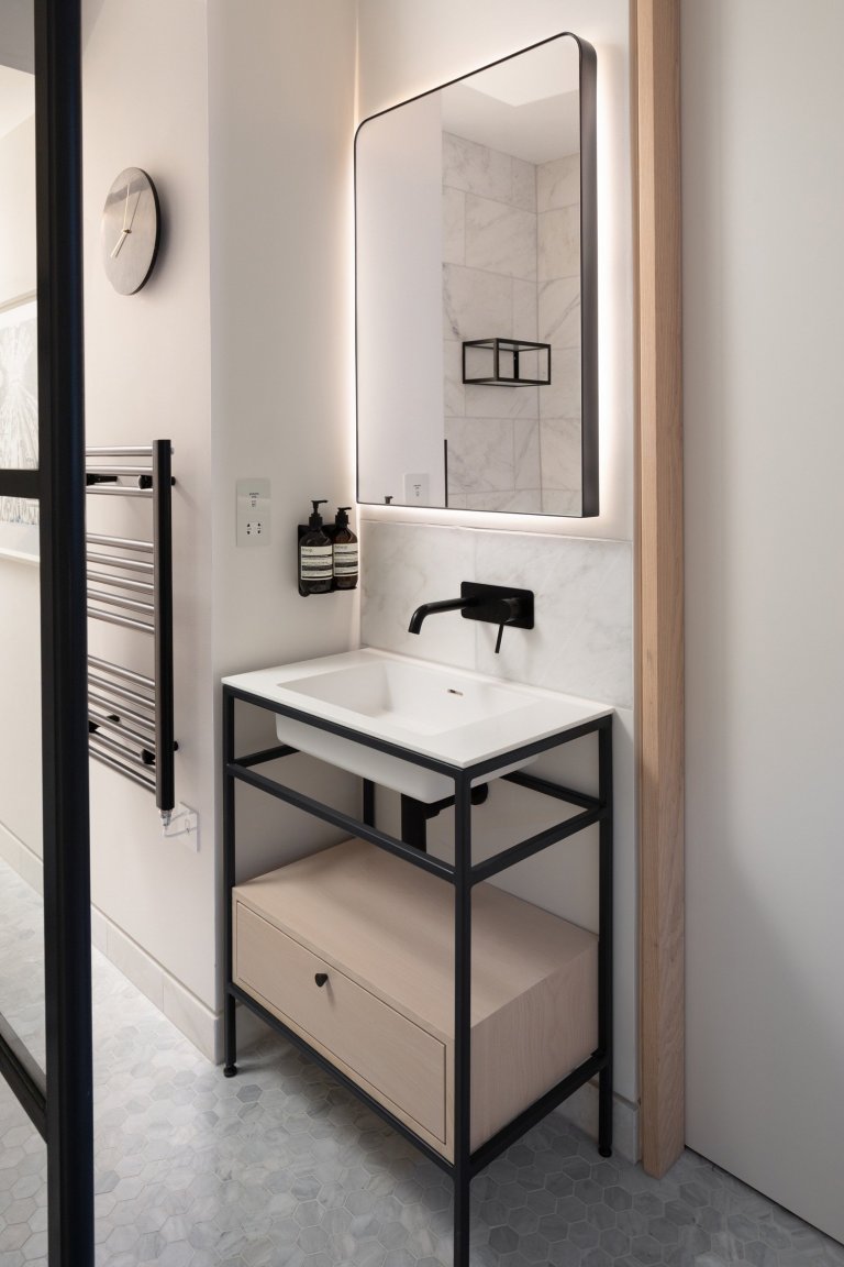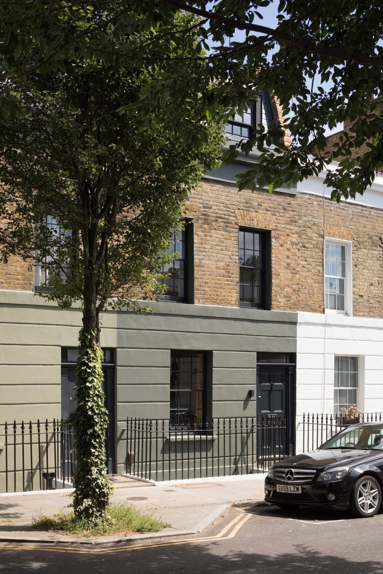 Proběhla kompletní modernizace domu. Hlavním aspektem je nové industriální schodiště, které je postaveno uprostřed domu, aby se vytvořilo lepší spojení a sounáležitost napříč všemi patry. Cílem bylo navržení nejefektivnějšího využití prostoru, vzhledem k jeho velikosti. Původní poloha schodiště nebyla vůbec dobrá. Přízemí bylo vzhledem k jeho poloze pocitově úplně oddělené od ostatních obytných prostor. Nové schodiště má tenké černé lišty, které ho oddělují, ale zároveň umožňují kontakt mezi ním a interiérem, a to díky prostupu světla. Nově je ve spodním patře kuchyň a jídelna, směřující k zadní zahradě. Prostor v přední části budovy zaujímá koupelna se sprchou a technická místnost.