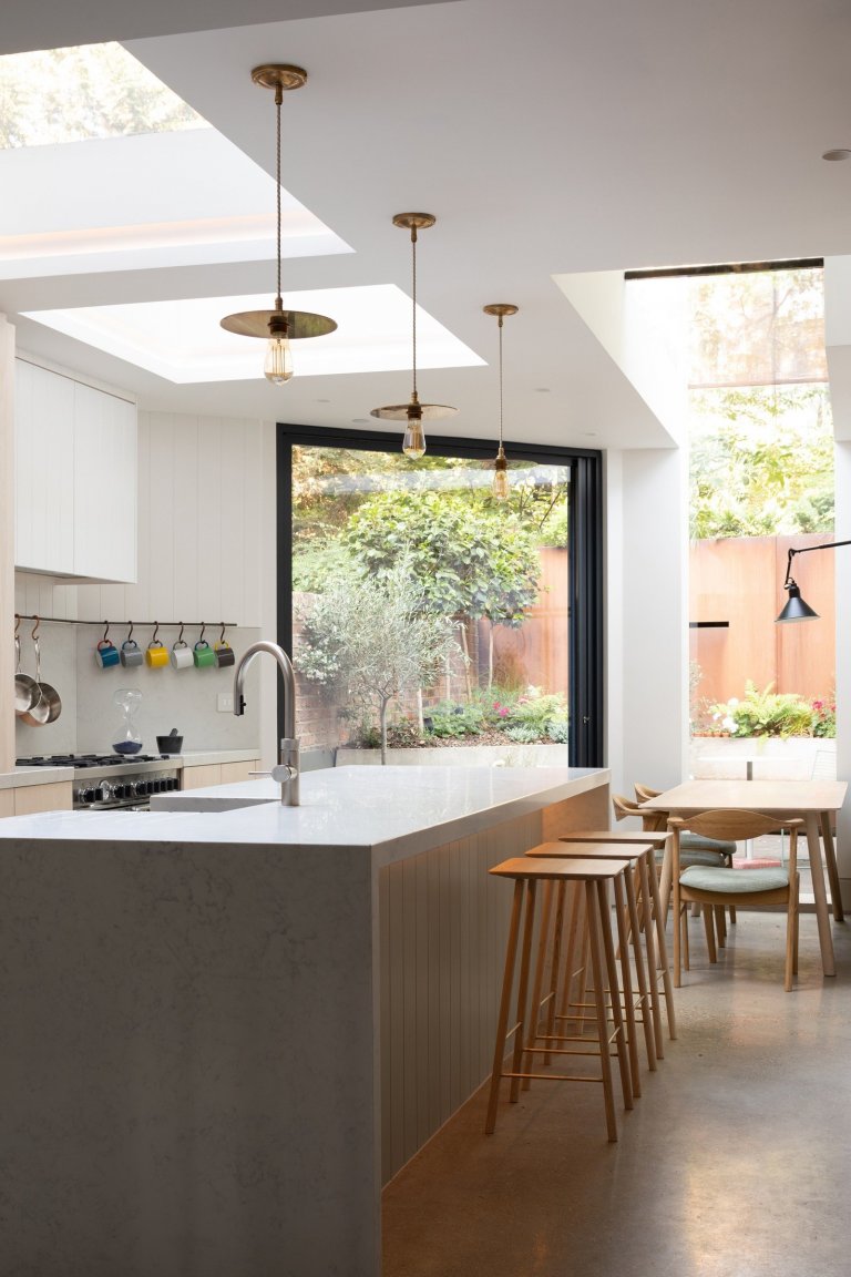 Stačí důmyslné řešení a řadový dům může majitelům poskytovat prostorné komfortní bydlení. Řadovka v Anglii má po rekonstrukci místo sklepa kuchyni s jídelnou a proskleným stropem.