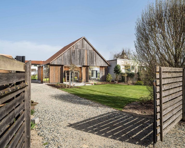 Zajímavou součástí tohoto domu je stodola, k jejímuž využití přistoupili architekti velmi osobitým způsobem. Vložili do ní totiž samostatnou zateplenou vestavbu, a tak zde vlastně vyrostl takový objekt v objektu. Vestavba přitom není se stodolou konstrukčně vázaná a ani zcela nekopíruje její půdorys. Výsledkem jsou tak zajímavě vyhlížející prostory jakoby na pomezí interiéru a exteriéru. V interiéru domu není nouze o prostor ani o dostatek denního světla. Dojem velkorysého prostoru pomáhá zvýšit otevření vestavby na výšku a o dostatečné prosvětlení domu se zase starají velká okna. Jedno z nich zdobí také prostornou koupelnu v bílé barvě, ze které je výhled přímo na vzrostlý rododendron v zahradě.