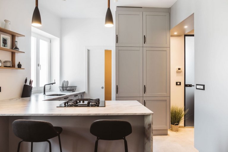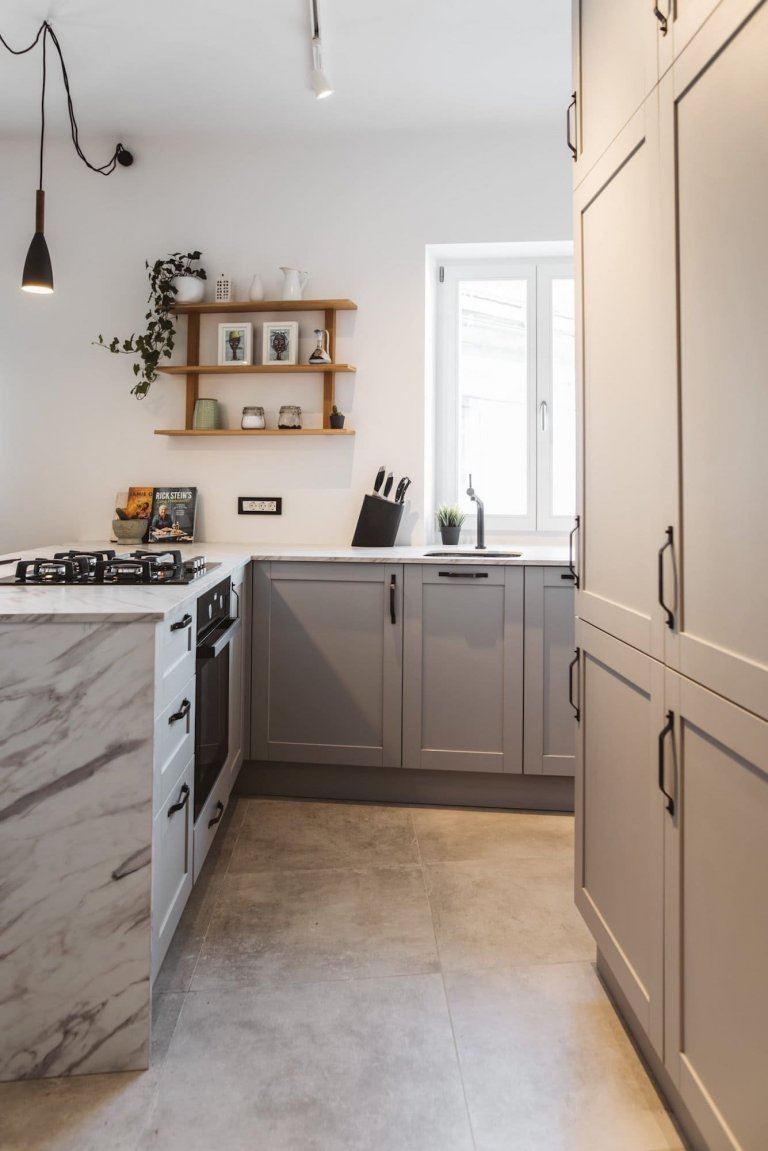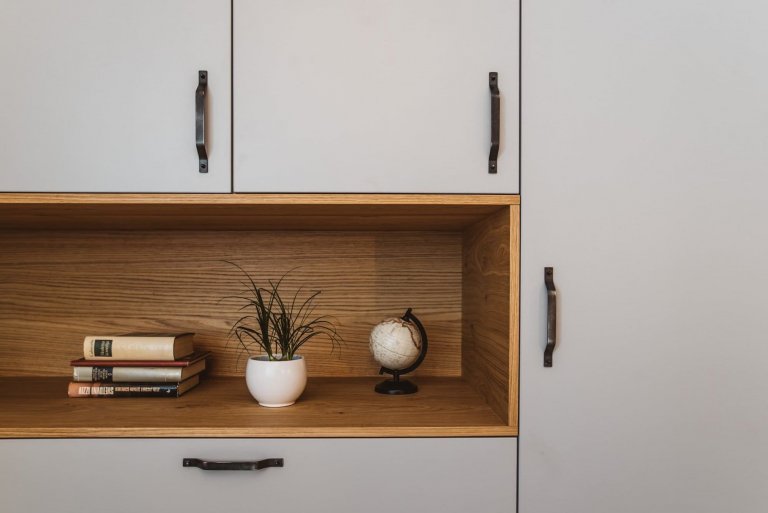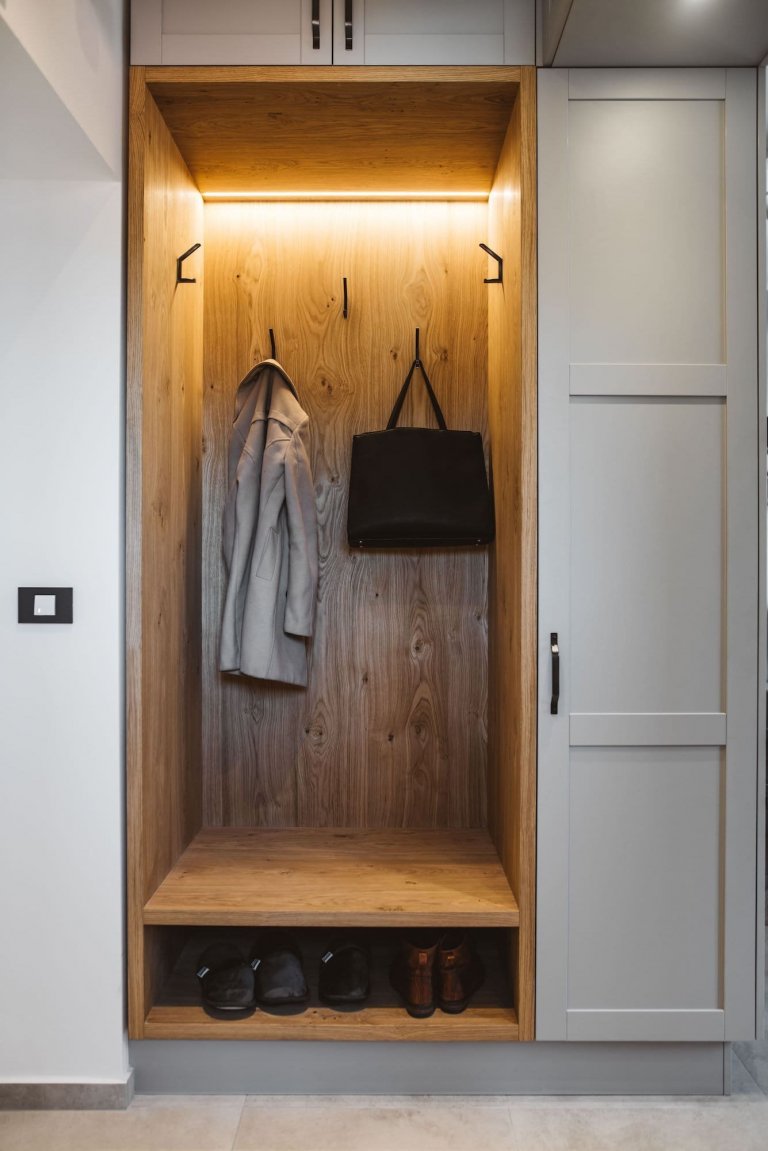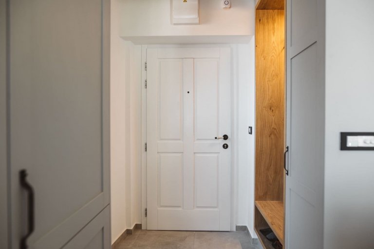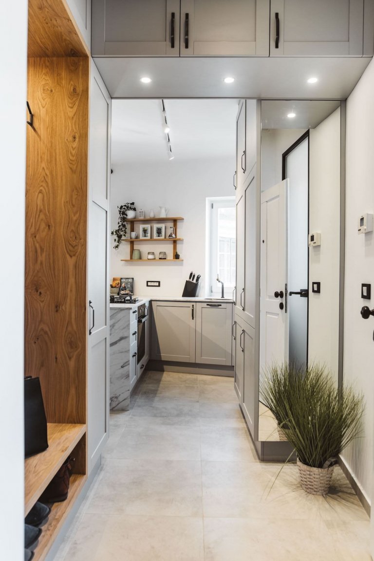 Starý nábytek byl nahrazen interiérovými doplňky na míru, které dodaly bytu moderní nádech. Oba architekti byli nicméně opatrní, aby konečný vzhled nebyl příliš sterilní. V bytě dominují neutrální tóny, bílá a šedá v kombinaci se dřevem. Místnosti byly také oživeny výběrem světel, od stropních po samostatně stojící. V chodbě, která je maximálně využívána, je skříň instalovaná až ke stropu, s inteligentně umístěnými závěsnými prvky v průchodu do kuchyně. Chodbu oživuje také zrcadlo namontované na kuchyňskou skříň. V koupelně a kuchyni jsou doplňky a příslušenství v černé barvě a desky působí dojmem mramoru. Podle přání majitelů byla kuchyň zvětšena a opatřena kuchyňským ostrůvkem. Ten vznikl vytvořením přepážky, ve které je lednice a další úložný prostor. Opticky se oddělí kuchyně od obývacího pokoje. Kuchyně je rustikální ve světle šedé barvě s černými držadly a pracovní deskou vyrobenou z cenově dostupné imitace ultra mramoru.