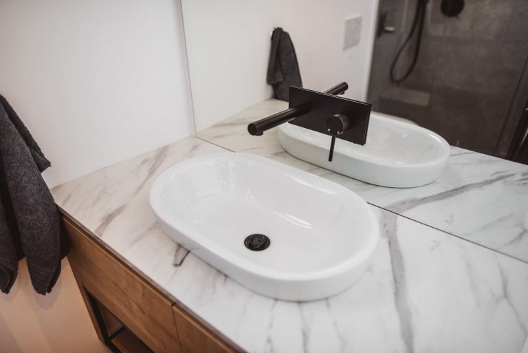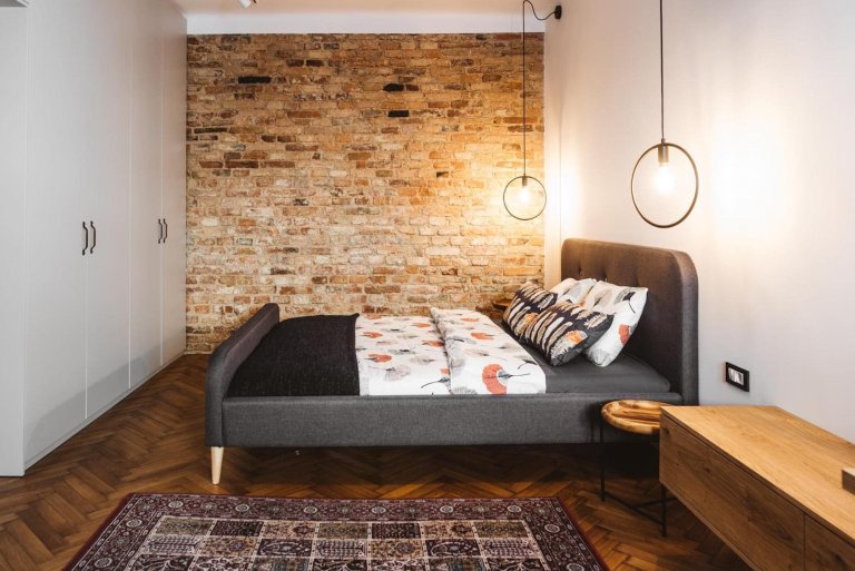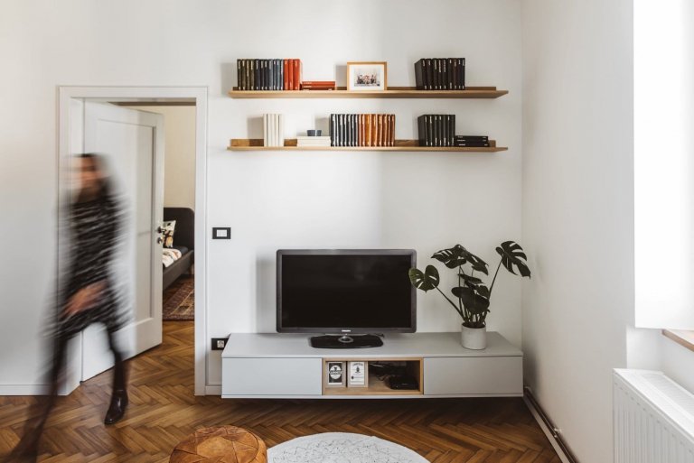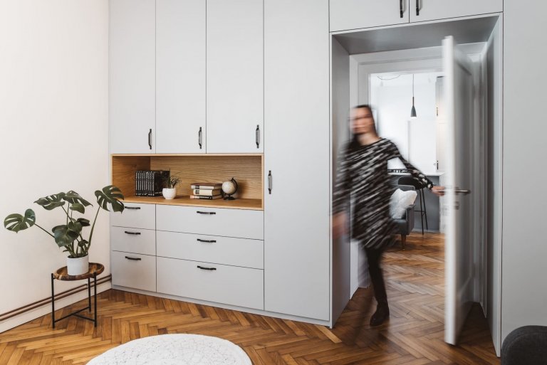 Rekonstruovat byt v chráněné budově není jen tak. Byl potřeba souhlas Ústavu ochrany kulturního dědictví, aby bylo možné vyměnit okna a většinu mechanických a elektrických zařízení. Stávající parkety byly zachovány, ale současně byl přidán další pruh nových parket a nová podlaha v kuchyni, hale a koupelně. Staré parkety, které dávají bytu zvláštní kouzlo, nejsou jediným „historickým“ detailem, který se dochoval. Stejně tak i cihlové zdi v jídelně a ložnici jsou původní, jen byla potřeba jejich obnova. Architekti Sanja Zvonković a Erika Šinkovec čelili výzvě, jak obytné prostory pocitově otevřít a spojit v jeden celek, a to na 50 metrech čtverečních. Pouze ložnice si zachovala stávající rozměr, i když následně byla lépe využita s přidáním úložných prostor. Ve zbytku bytu byly zbourány nenosné zdi, aby bylo možné vyhovět všemu, co majitelé chtěli. Namísto vany byl v koupelně nainstalován sprchový kout a menší skříňka s umyvadlem byla nahrazena větší. Důležitým posunem byla kuchyně. Tam, kde dříve stávala, je nyní kout s pračkou. Otevřený prostor byl efektivně vyřešen pomocí skříní, které zde fungují jako přepážky a navíc nabízejí dostatek úložných prostor, které jsou v malém bytě velmi ceněnou záležitostí.
