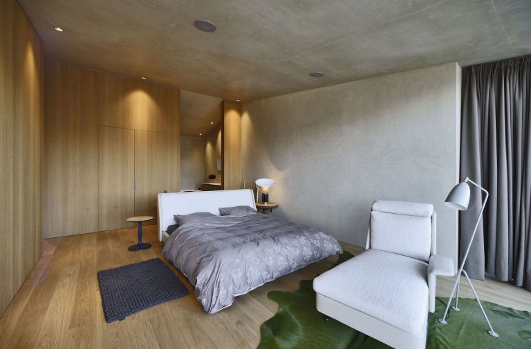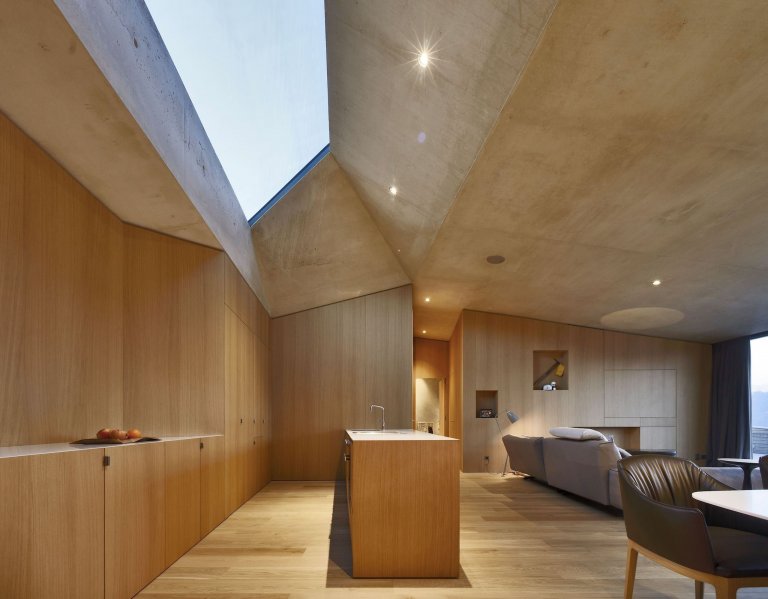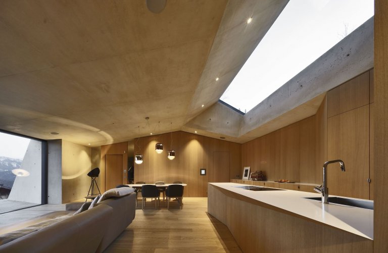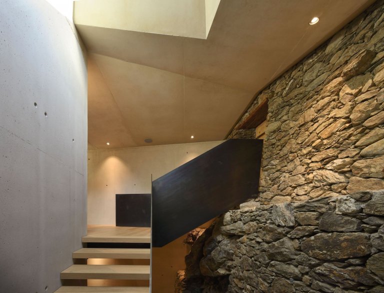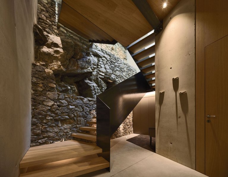 S velkou světlou výškou přístavby, otevřenou dispozicí a výhledy kontrastuje s uzavřenou strukturou historické stavby. Změna prostředí a možnost přesunu z intimních místností do otevřeného, téměř galerijní prostoru je jedním z největších benefitů návrhu. V interiéru přístavby převládá zejména pohledový beton, který nechává vyniknout geometrii stavby. Beton doplňují dřevěné vestavěné nábytky. Spojovacím prvkem mezi starým a novým se stalo schodiště. Vertikální komunikace propojuje garáž a obytný prostor a slouží také jako přechod mezi původním domem a přístavbou. Toto místo se stalo křižovatkou materiálů a provozu. Všechny materiály jsou zde odhaleny a jasně odlišeny. Přírodní kámen se setkává s pohledovým betonem, dřevem a kovem.
