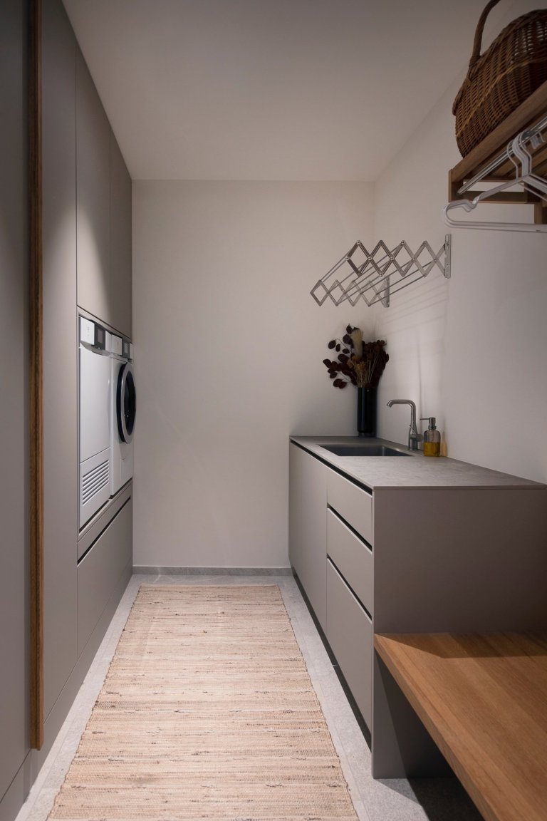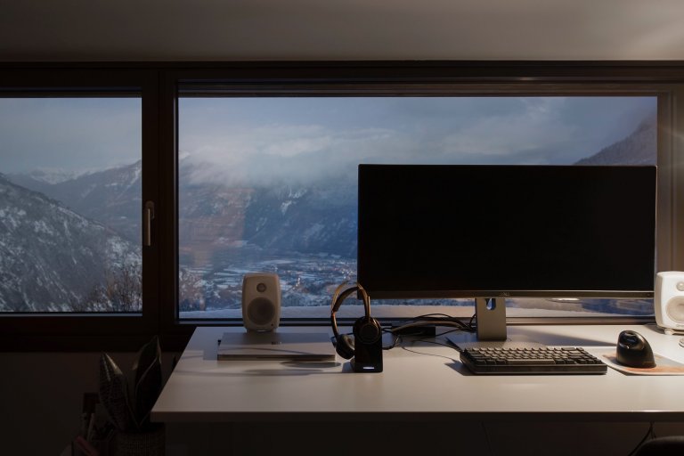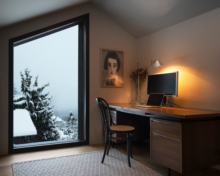 Pozemek, na kterém nová rodinná vila stojí, je dokonale orientován k údolí řeky Rhôny. Nabízí tak celou řadu rozmanitých výhledů, které jsou rámovány ve všech obytných místnostech. Výhledy z ostatní prostor směřují pro změnu k hlavní cestě. Jelikož oba manželé pracují z domova, velký důraz byl kladen právě na domácí pracovny, které na první pohled zaujmou velkolepými výhledy do zasněžených hor. Kancelářské patro bylo umně integrováno do podkroví pod velkým střešním oknem. O inspiraci tu tak opravdu není nouze. A také o dostatek přirozeného světla, které je pro práci tolik důležité. Světlý a plný výhledů je celý interiér, což je také jeho největší devizou.