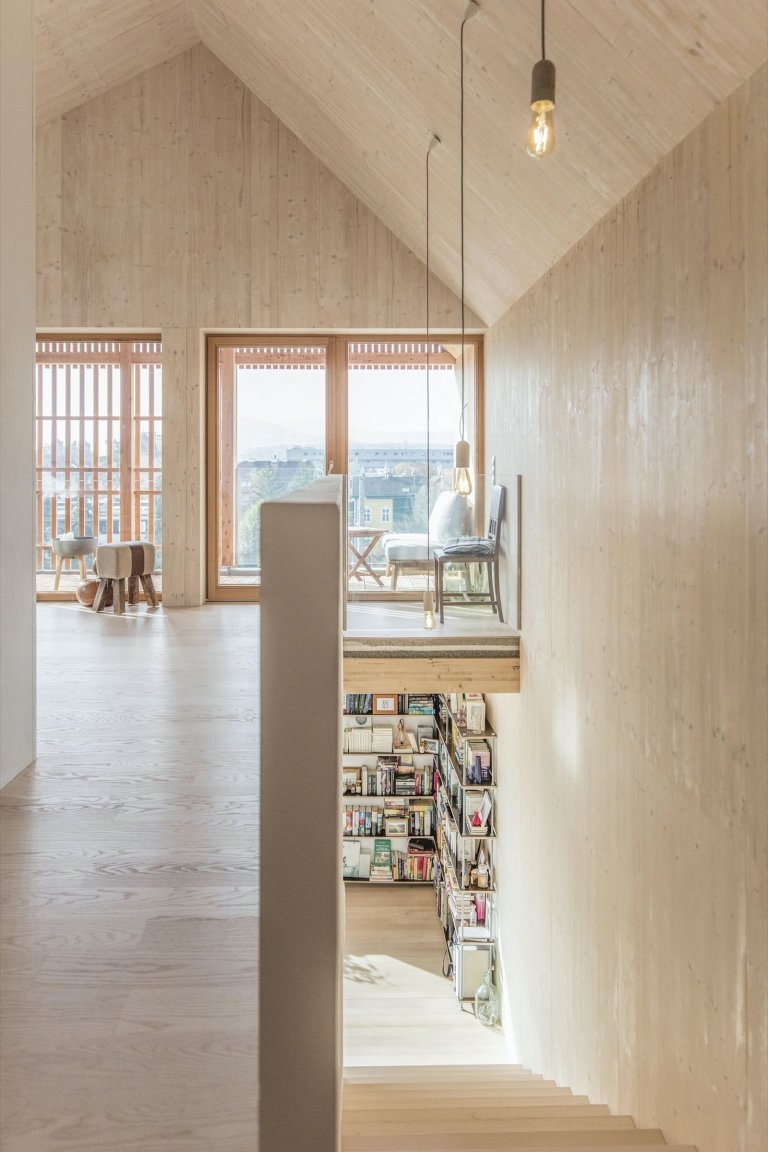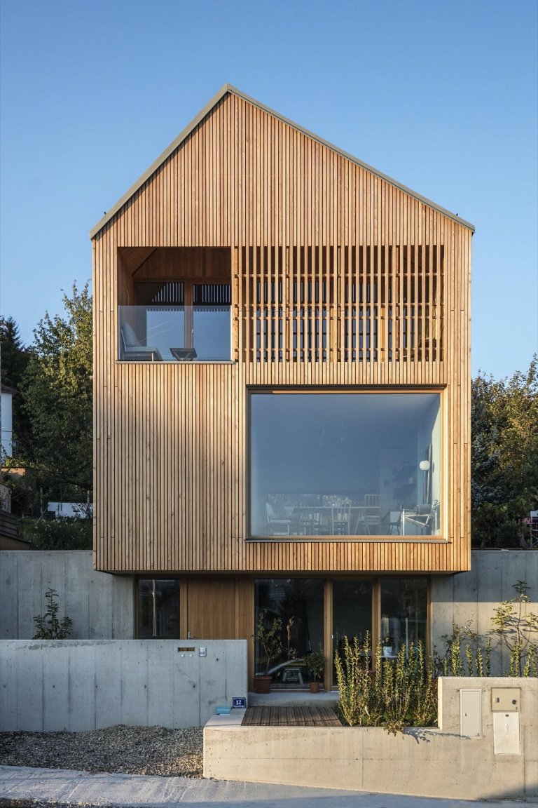 Dřevěné podlaží domu jsou vykonzolované za obrys betonového zdi - podobně jako skalní převis. Řešení ukrývá symboliku ve vztahu k majitelům. Ti patří k elitním rakouským lezcům.