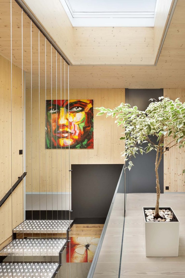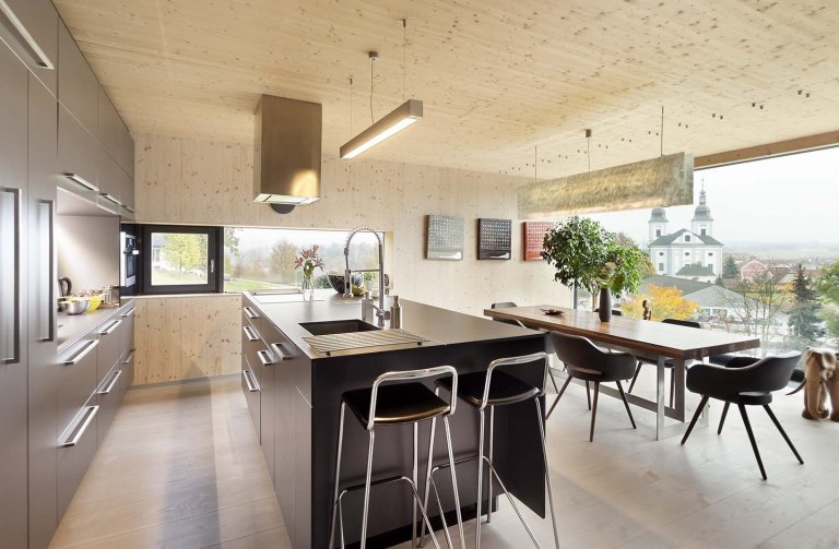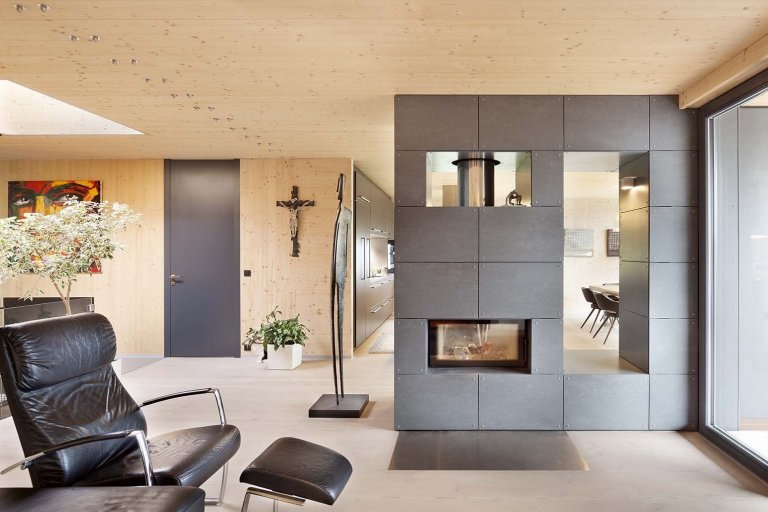 V exteriéru i interiéru domu převládá dřevo v příjemně světlém tónu. Povrchy stěn a stropů z masivního smrkového dřeva střídají betonové a ocelové prvky. Právě nádech industriálního stylu tak interiéru dodává na osobitosti. Všechna konstrukční řešení jsou zde přitom jasně přiznaná. Dřevo, které celému interiéru vévodí, doplňuje rozměrné krbové těleso z šedého cembonitu, jež v domě zajišťuje tu správnou pohodu. Podmanivou atmosféru bydlení pak dokresluje například stůl s masivní ořechovou deskou nebo autorský lustr.