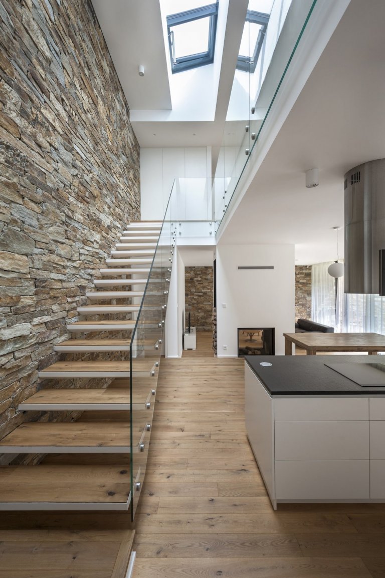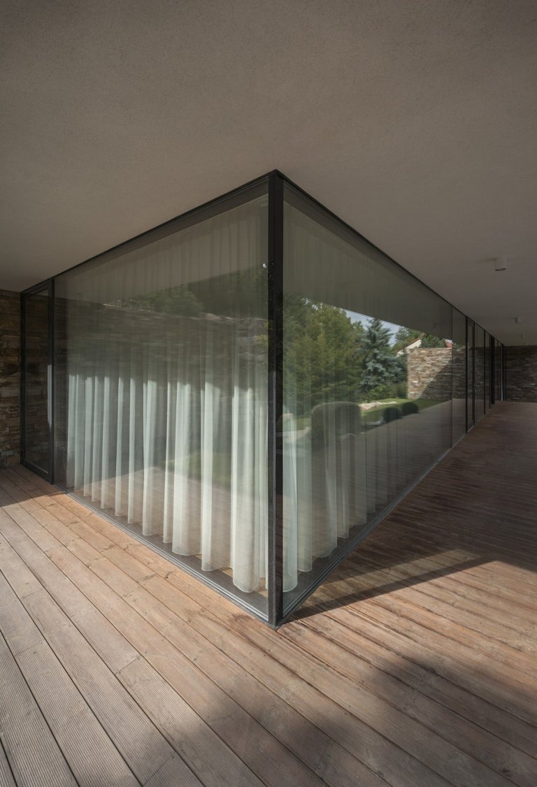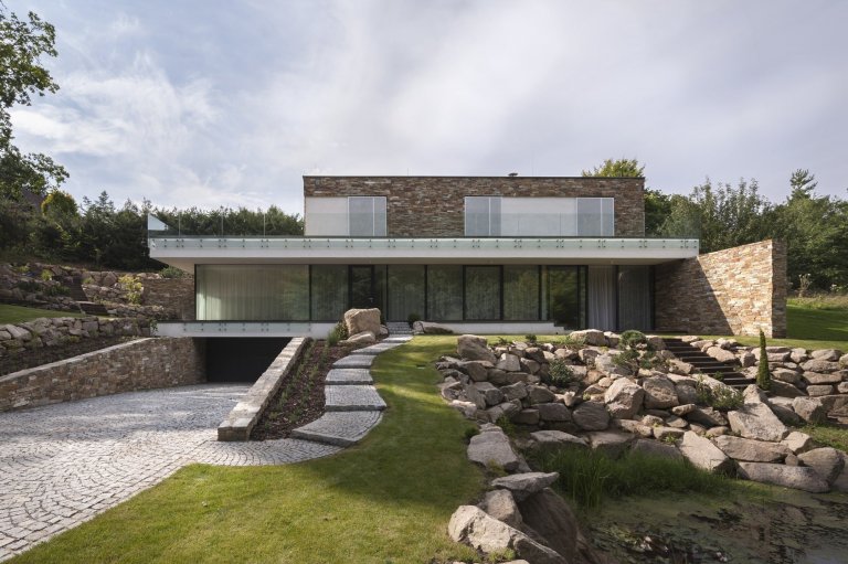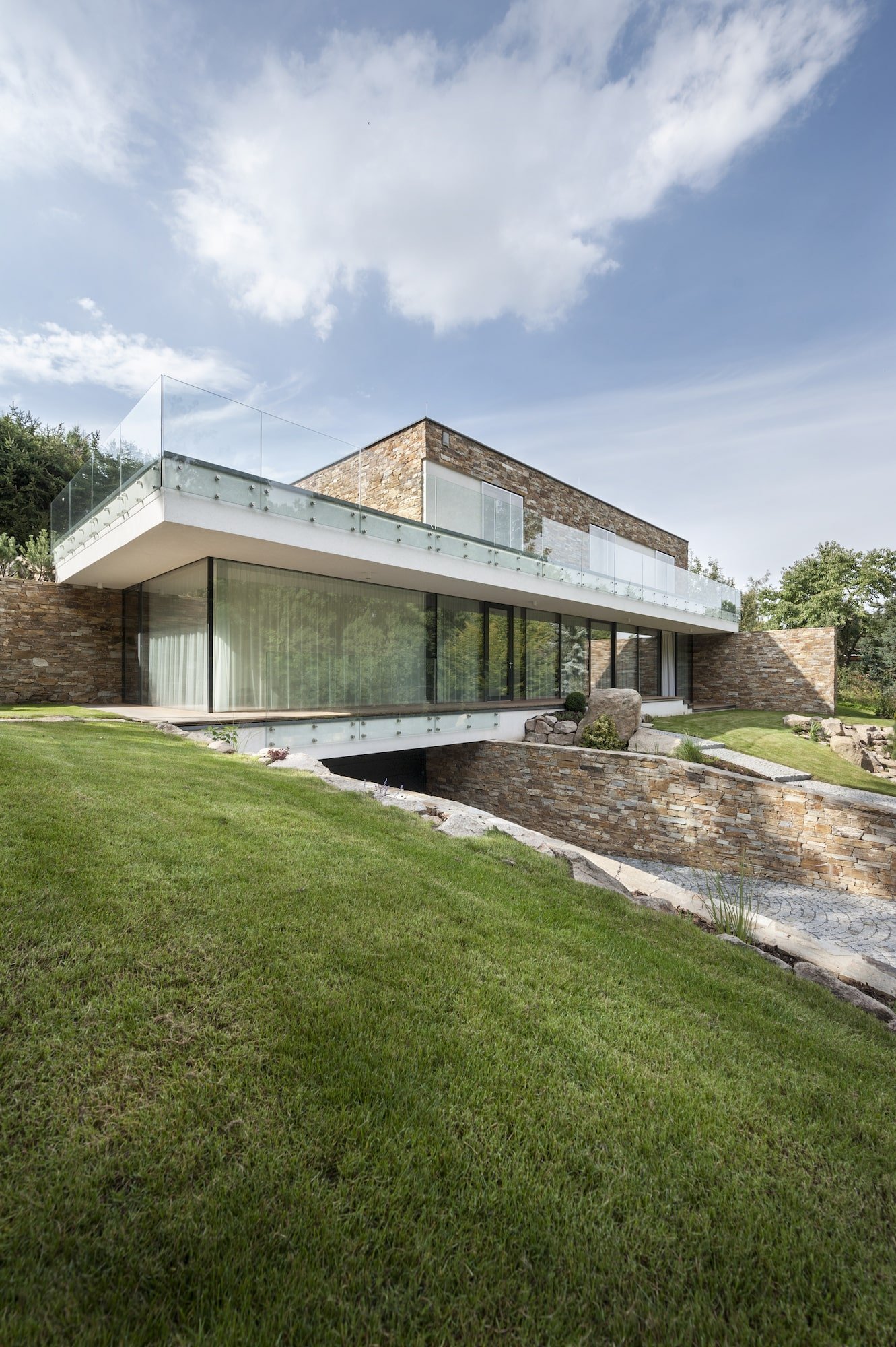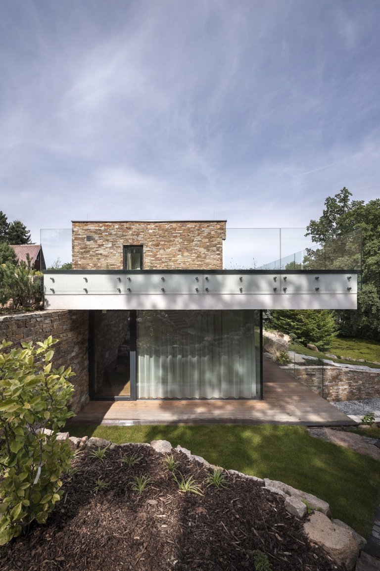 Celý dům se skládá ze dvou základních hmot, kdy je ta spodní, z níž je vytvořeno obytné podlaží domu, částečně zapuštěna v terénu. Části domu, které jsou orientované směrem do zahrady, jsou celoplošně bezrámově prosklené a umožňují tak dokonalý přechod mezi interiérem a exteriérem. Směrem k vedlejšímu pozemku a ke svahu je přízemí vymezeno opěrnými zdmi z lomového kamene, kdy najdeme stejně vypadající obklad i v interiéru.