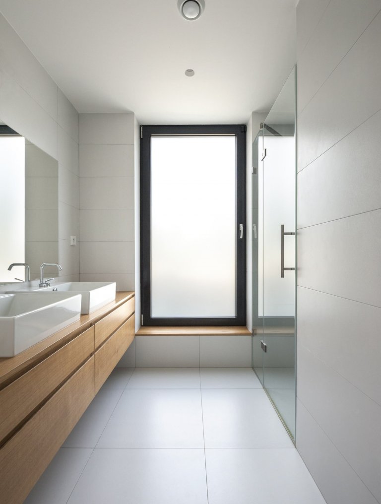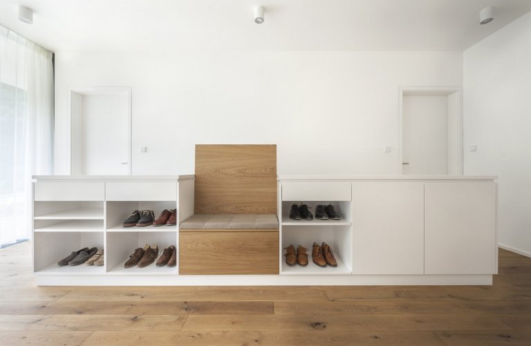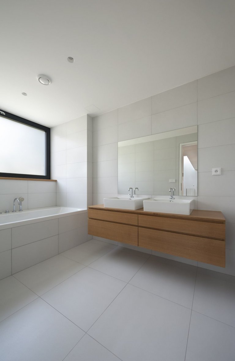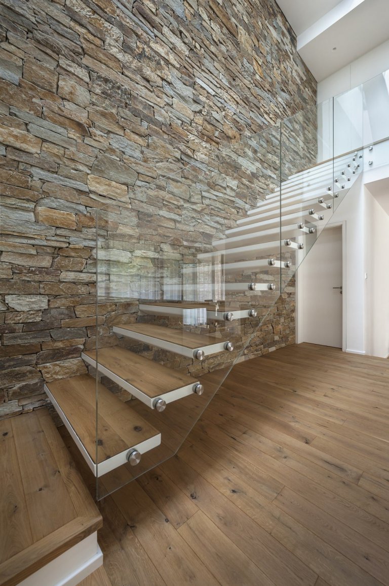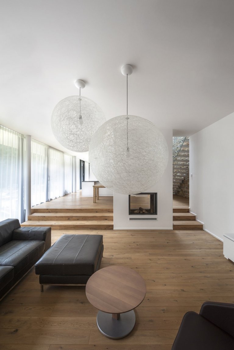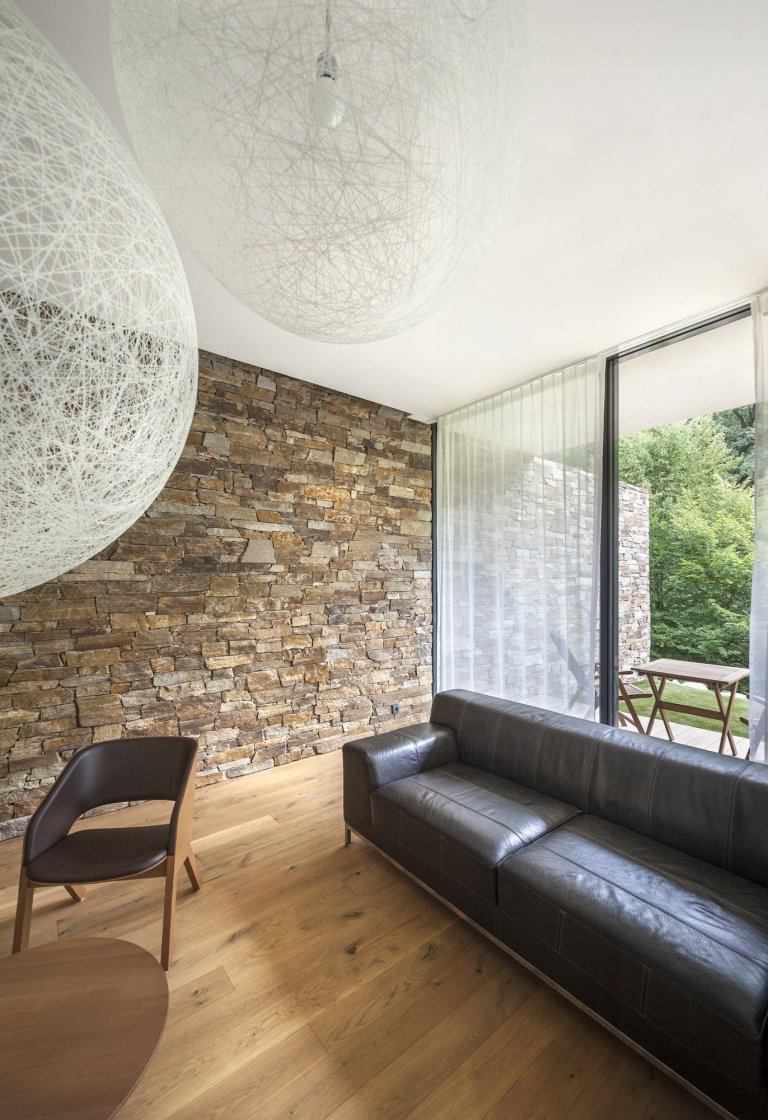 Celý dům se skládá ze dvou základních hmot, kdy je ta spodní, z níž je vytvořeno obytné podlaží domu, částečně zapuštěna v terénu. Části domu, které jsou orientované směrem do zahrady, jsou celoplošně bezrámově prosklené a umožňují tak dokonalý přechod mezi interiérem a exteriérem. Směrem k vedlejšímu pozemku a ke svahu je přízemí vymezeno opěrnými zdmi z lomového kamene, kdy najdeme stejně vypadající obklad i v interiéru.