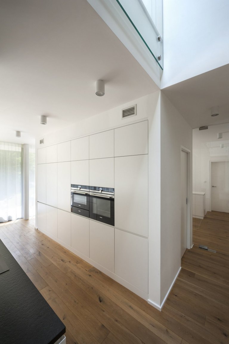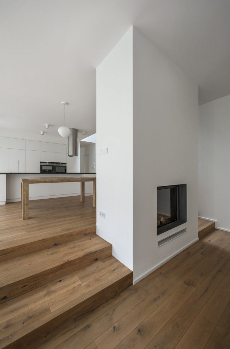 Interiér domu je dispozičně velmi otevřený. Od vstupní haly se dostaneme do obytného prostoru okolo kuchyně, šatny, technických prostor a výtahu z garáže. V místě změny světlé výšky prostoru je vložen blok s oboustranným krbem, který od sebe odděluje jídelní a relaxační část domu. Kolem celého přízemí se nachází krytá terasa. Za pozornost poutající prvek v interiéru lze považovat konzolové ocelové schodiště vedoucí do patra, jež je osvětleno střešním světlíkem. Dům je postaven jako nízkoenergetický, kdy se klade důraz na využití solárních zisků v zimních měsících a omezení přehřívání během zbytku roku.