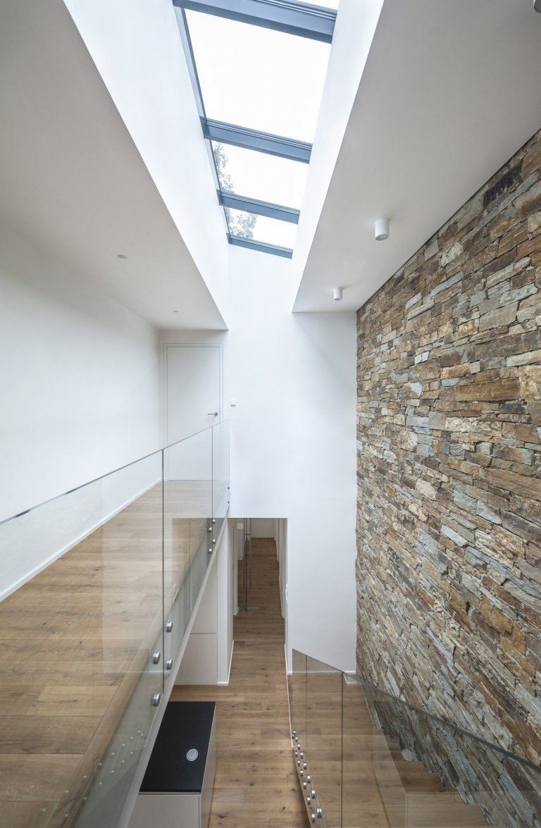 Hmota patra je oproti té spodní o něco menší a ustupuje oproti hraně přízemí. Slouží k soukromějším funkcím, takže je uzavřenější, přičemž fasádu z velké části obklopuje fasáda z kamene, jímž je obložena. Okna ložnice lze zastínit posuvnými okenicemi z perforovaného plechu. Okna směřují do zahrady, kde můžeme vystoupit na dřevěnou palubu přecházející v zelenou střechu a horní část zahrady.