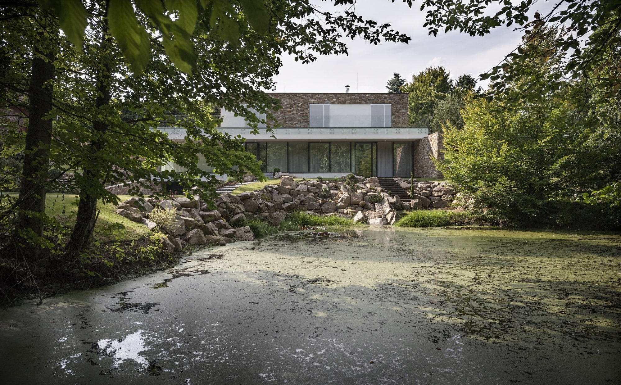 Rodinný dům byl postaven na z velké části zalesněném pozemku v blízkosti rybníka, který se nachází v otevřenější části parcely. Cílem projektu bylo vsadit hmotu nového domu do terénu tak, aby splynul s okolní zahradou a svahem.