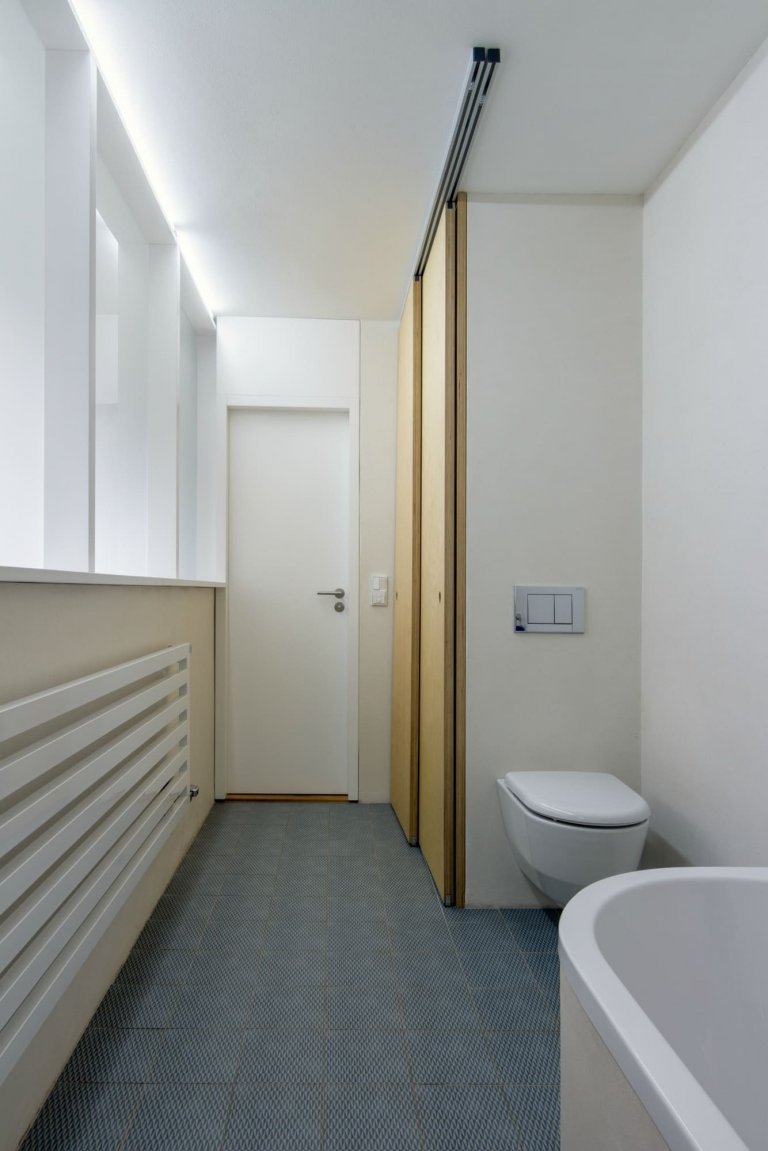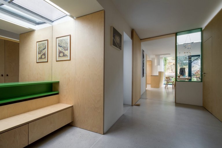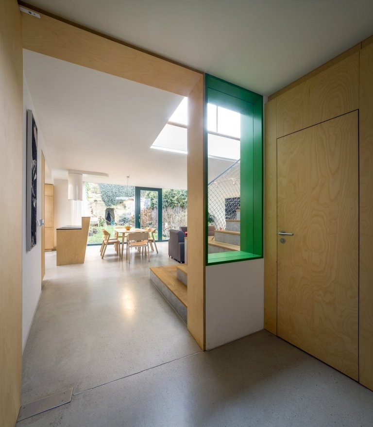 Jednou z největších výzev bylo přivést do interiéru domu co nejvíce denního světla. Původní tmavou kobku utopenou mezi domy sousedů bylo třeba prosvětlit, co nejvíce to šlo. Přízemní vestavby do uličky tedy získaly prosklené stropy. Obývací pokoj s prosklenou fasádou směrem do zahrady podpořilo ve stejném úmyslu i velké okno v patře nad schodištěm. Nejenže jím mohou sluneční paprsky pronikat do zadních částí obývacího pokoje, ale prostřednictvím pásového vnitřního prosklení slunce svítí také do hlavní koupelny. A protože je zde pamatováno na všechno, mají horní kuchyňské skříňky zkosený tvar, aby nebránily dennímu světlu procházejícímu skleněnou střechou nad kuchyní. Dům mimo jiné zachycuje světlo také díky svému vyvýšení nad okolní zástavbu.