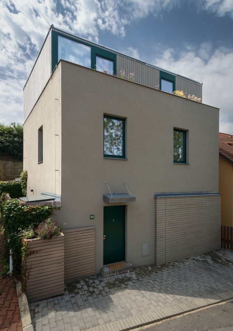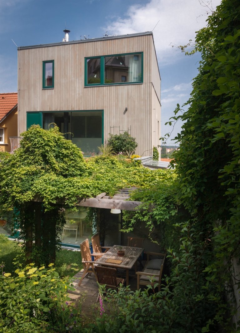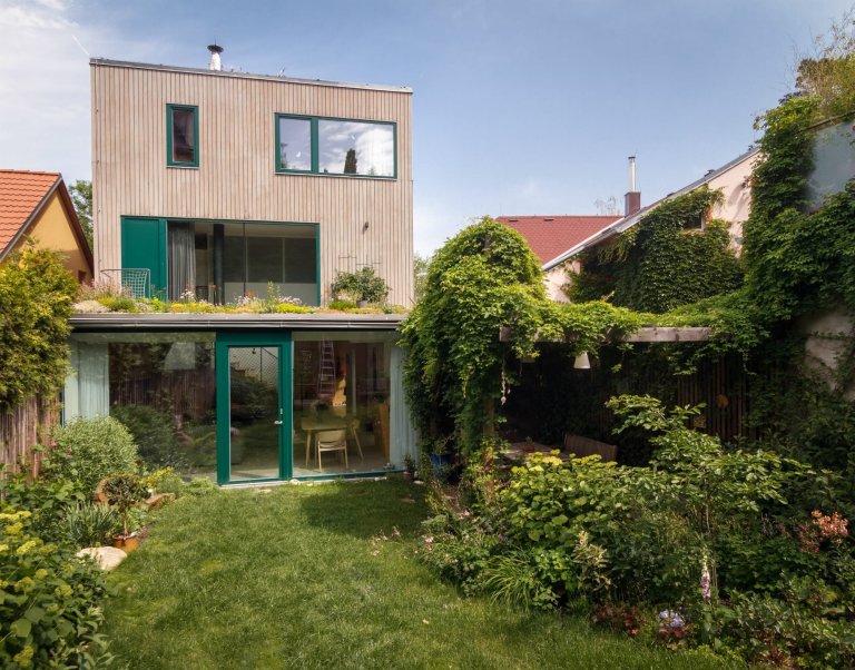 Volně rostoucí zahrada napomáhá dodat prostoru kolem domu na vzdušnosti a živelnosti. Bujnost rostlin nedbá na hranice a rozpíná se k sousednímu domu. Vzniká tak zahrada se svobodomyslnou atmosférou. O soulad s přírodou se snaží i většina prvků přestavěného domu. Okolnímu prostředí se tak přizpůsobuje i fasáda nového bydlení. Zatímco je směrem do ulice omítnutá, směrem do zahrady je obložená dřevem stejně jako nejvyšší podlaží. Také subtilní dveře garáže zjemňují dřevěné obklady. Obývací zóna je zastřešená zelenou střechou, která tak zpříjemňuje výhled z oken ve vyšších podlažích. Ze zahrady pak celek působí neskutečně kompaktně a v souladu s přírodou, která má prostor všude, kde to jen trochu jde.