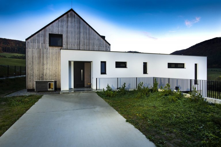 Příjemnou šedou patinu dřeva, použitého na fasádě denní části domu, střídají precizní monochromatické plochy nižšího traktu. Bezpresahová střecha a skryté žlaby nechávají vyniknout kompozici dvojice bloků. Prostorový koncept je obohacen o převáží zónu obývacího pokoje, otevřenou na celou výšku krovu.