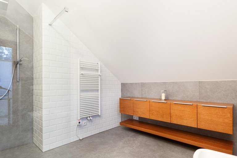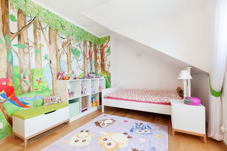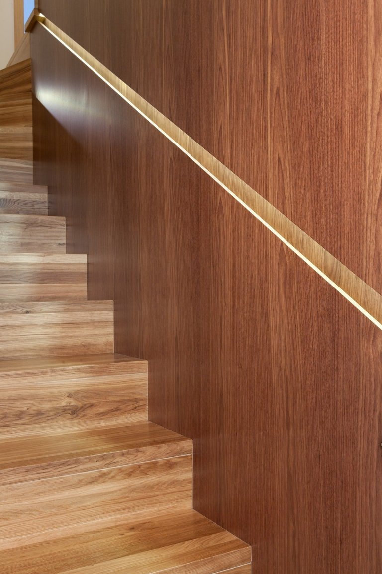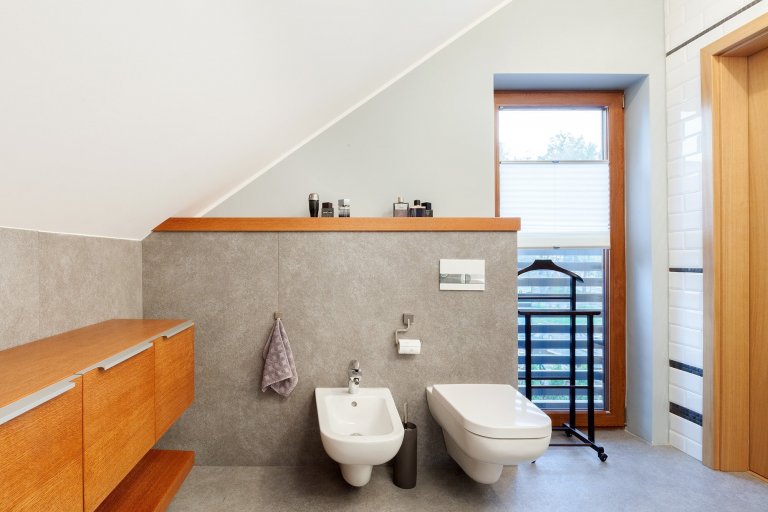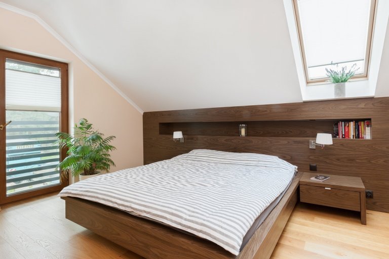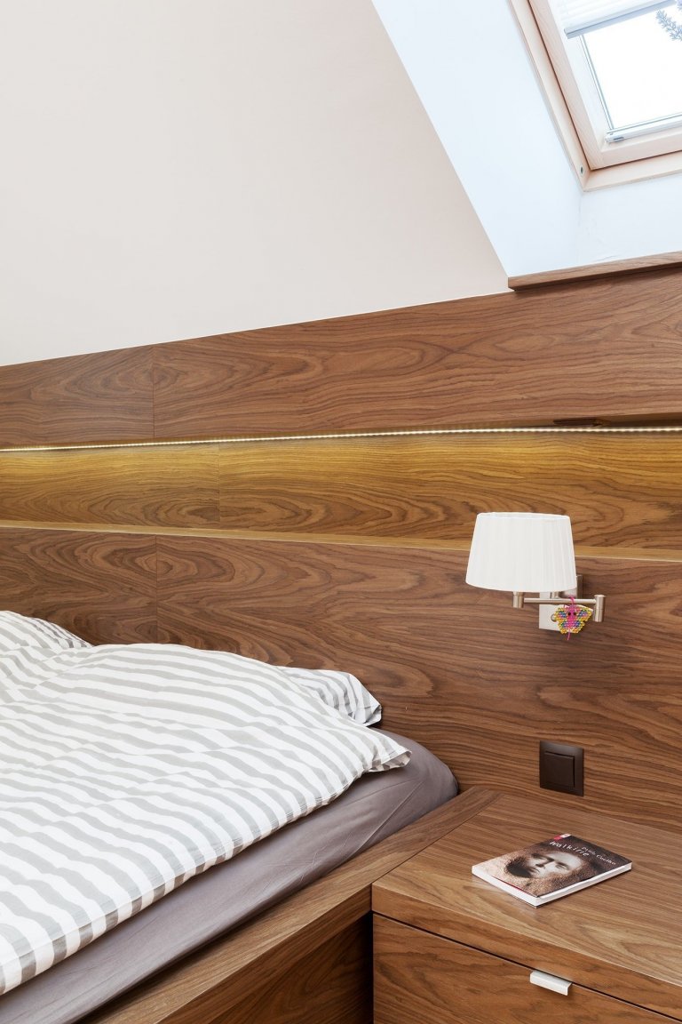 Dům má přízemí a první patro v podkrovní části. Ložnice majitelů je v patře, stejně jako pokojíčky pro děti a dvě koupelny. Obložení dřevem ložnice působí luxusně a šmrnc mu dodává také použité osvětlení. Při návrhu byl kladen důraz na praktickou stránku, a proto jsou skříňky v koupelně i ložnici zavěšeny na zdi. Za zmínku stojí určitě i krásné dřevěné pravotočivé schodiště, s důmyslným osvětlovacím elementem.