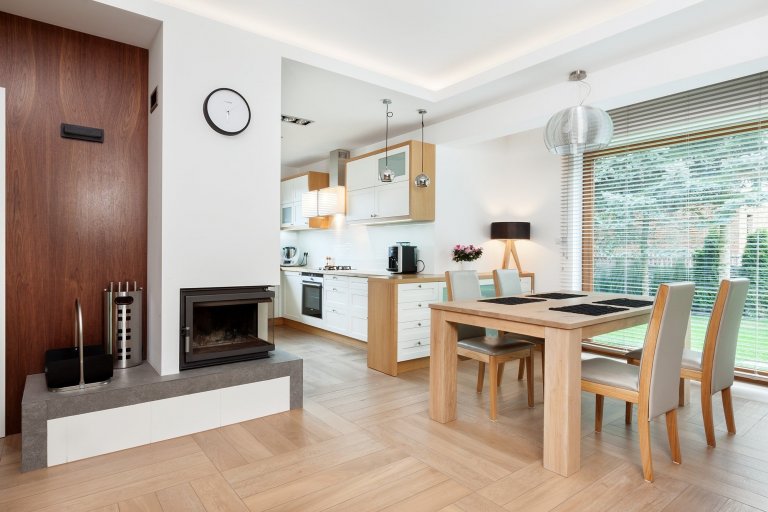 V přízemí domu se nachází obývací pokoj s kuchyní, jídelním koutem a chodbou. Dominantou obýváku je cihlová zeď a krb uprostřed místnosti. Mezi kuchyní a obývací částí je situován jídelní stůl. Je přímo u okna a díky tomu může být stravování rodiny o to příjemnější. Zároveň je na druhé straně krb, který také přispívá k příjemné atmosféře. Světlé dřevo se zde prolíná s bíle lakovanými povrchy, působí příjemně a útulně.