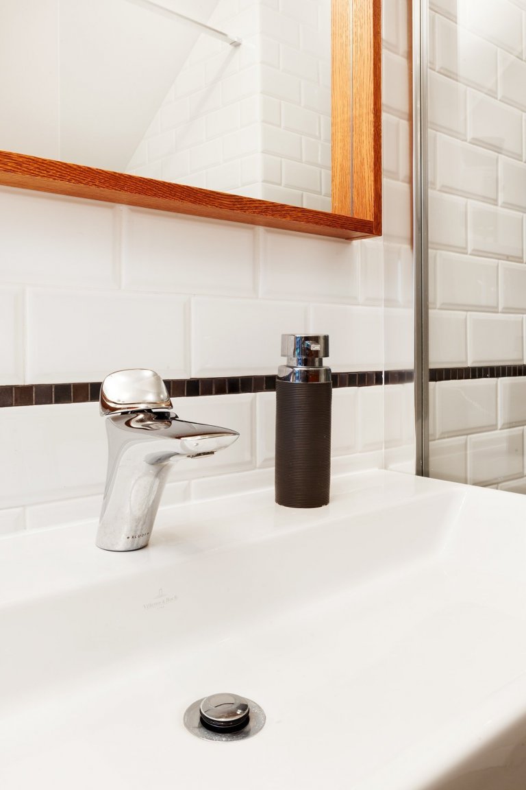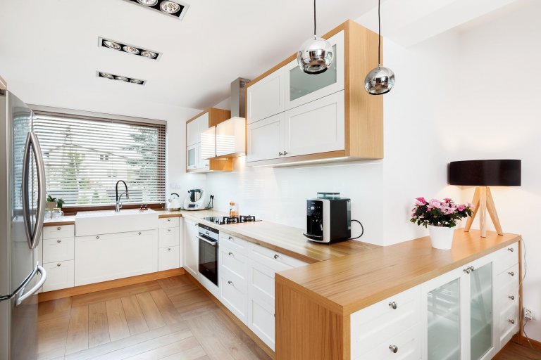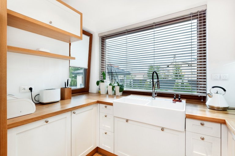 Kuchyně je směsicí moderního stylu s mírně rustikálním. Architekti zde navrhli kuchyň s profilovanými dvířky, knopkami, masivní pracovní deskou a vystupujícím keramickým dřezem. Místo obkladu je použito praktické tvrzené sklo a pracovní prostor osvětlují LED pásky v horních skříňkách.