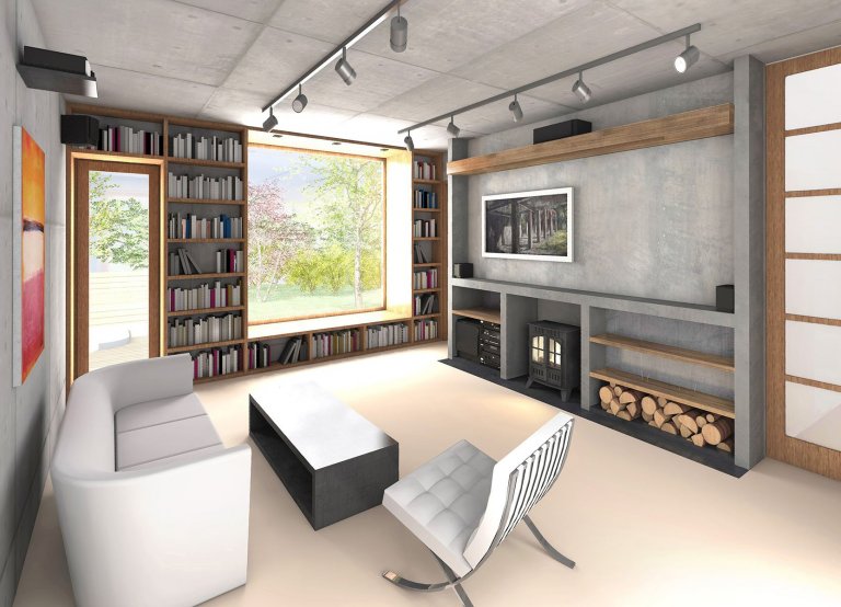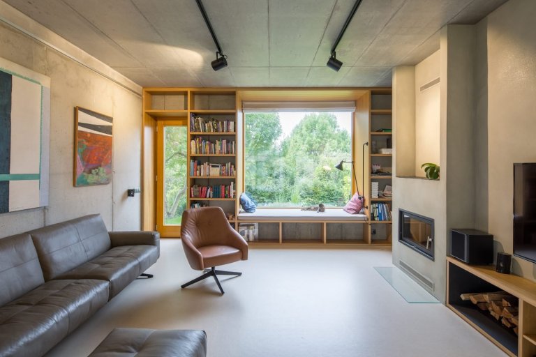 Srdcem domu je prostorný obývací pokoj, který pomocí velkých oken propojuje přední a zadní část zahrady. Oboustranně orientované zasklení, zajímavě řešená knihovna, vysoce komfortní sedací souprava a hřejivý krb – to jsou stěžejní prvky, které pomáhají k vytvoření atmosféry jako stvořené k odpočinku v této velké a vzdušné místnosti. V témže podlaží se nachází také prostorná kuchyně, jídelna a ložnice rodičů orientovaná na severozápad. Pro děti je vyhrazeno první patro. Ze svých dětských pokojů přitom mohou vejít přímo na střešní terasu.