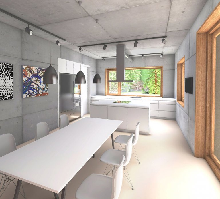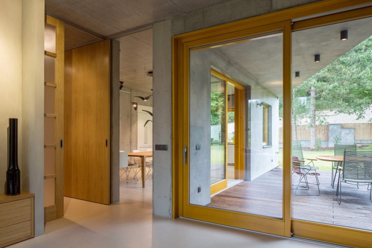 Půdorys domu ve tvaru písmene U kopíruje venkovní terasa, která rozšiřuje pobytový prostor a dodává mu další příjemné útočiště zajišťující velkou míru soukromí. Dům tímto směrem vyhlíží k oboře, která se nachází poblíž. Jedná se o dvoupodlažní objekt, který je částečně podsklepený. Má plochou střechu a střešní nástavbu. Střešní nástavba, která vyčnívá nad rovinu ploché střechy, zpřístupňuje krytou střešní terasu. V exteriéru i v interiéru dává dům plně vyniknout použitým materiálům. Prim zde hraje pohledový beton v kombinaci s dubovým dřevem. Toto kontrastní řešení vystavuje na odiv přirozenou texturu a barevnost materiálů.