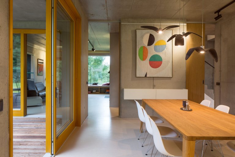 Bydlení v domě u Hvězdy je minimalistické, vzdušné a čisté. Vznikly v něm příjemné koutky jako stvořené pro trávení času s knihou, ale i pro povídání si s přáteli. Poněkud chladný beton prohřívají světlé tóny dřeva, atmosféru v interiéru osvěžují také výhledy na neustále se měnící přírodu.