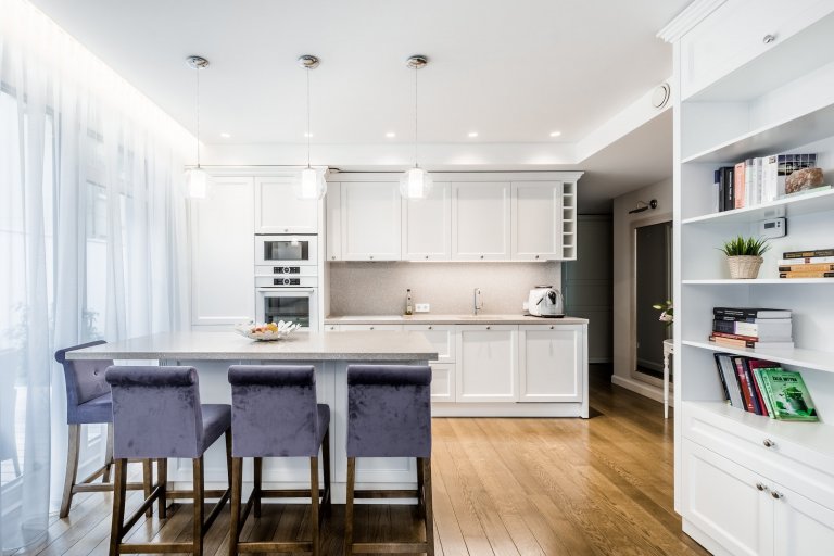 Luxusní dojem z bydlení vytváří nejen frézované zdobné prvky nábytku, ale také svítidla, nebo zvolené látky potahů. Barové židle u ostrůvku v kuchyni designéři očalounili fialovým sametem a dali tak židlím, ve světlém interiéru, lépe vyniknout. S texturou látek si designéři pohráli i v ložnici, a to na čalouněném čele postele, polštářích, nebo závěsech.