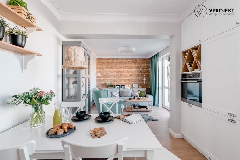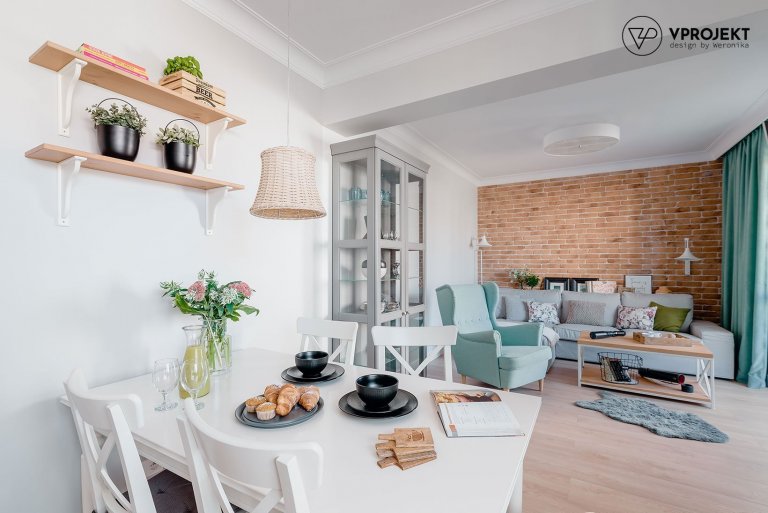 Záplava bílé barvy sluší i interiéru, který získal na svěžesti a eleganci díky profesionálům ze studia V Projekt. Bílá barva zde příjemně splývá s většinou nábytku, tudíž se celý prostor účinně prosvětluje a opticky zvětšuje. Elegantní křivky nábytku inspirovaného historizujícími slohy mohou o to více vyniknout. Jistá elegance je patrná napříč celým interiérem, který byl zařizován opravdu s citem pro detail i ladné kombinace barev. Převahu poněkud studenější bílé barvy v interiéru prohřívají akcenty pastelových tónů. Do popředí zájmu se tak dostává především světle modré retro křeslo či až na zem splývající závěsy v tmavším tónu akvamarínové barvy. Jemné akcenty přecházející od svěže modré po zelenou dodávají interiéru dotek svěžesti a energie. Chybět tu tedy nemohou ani řezané a pokojové květiny.