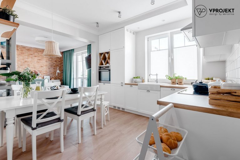 Elegantní kombinaci bílé a akvamarínové barvy příjemně vyvažují s citem zakomponované rustikální prvky. Hřejivý dotek venkova tak do interiéru přináší obnažené cihlové zdi, dřevěné podlahy, stolky a poličky, proutěné lustry a květináče na bylinky či něžné polštářky s květinovým potiskem. V řadě prvků se přitom spojuje krása s praktičností, ať už to platí pro pojízdný vozík na jídlo nebo polstrovanou lavici v předsíni. Elegantní styl kráčí v tomto interiéru ruku v ruce s rustikálním, aniž by na sebe přehnaně strhával pozornost.