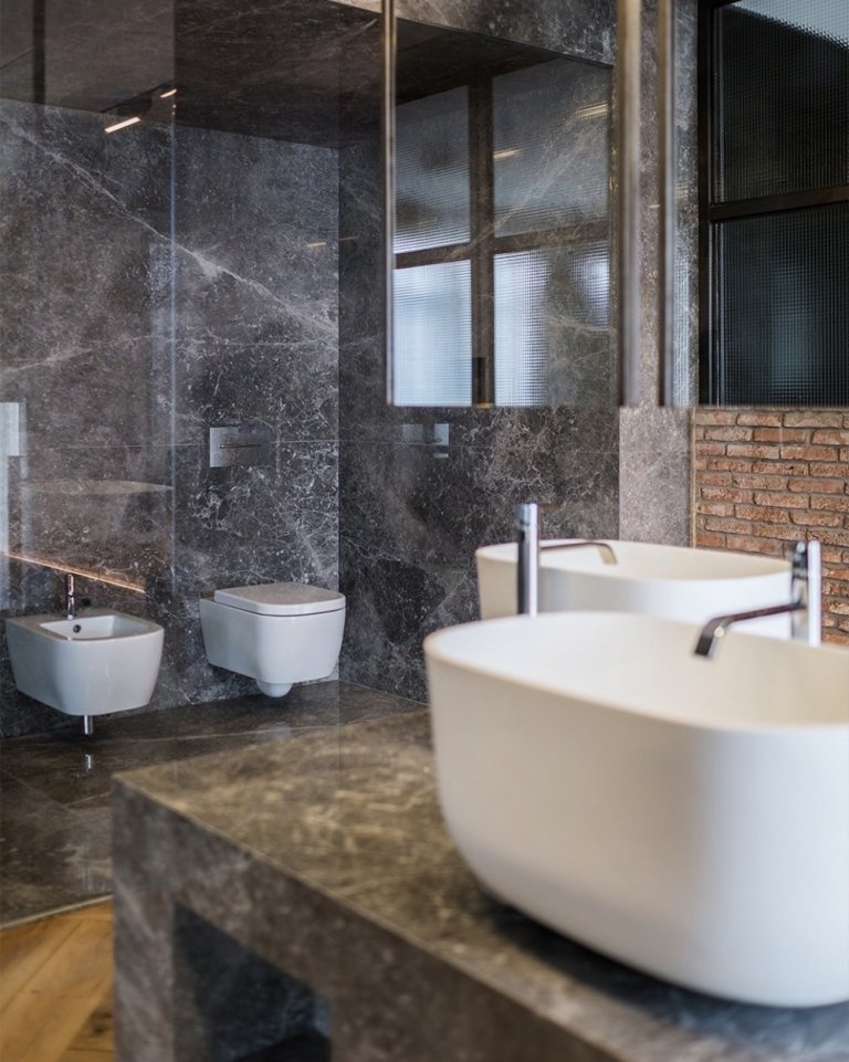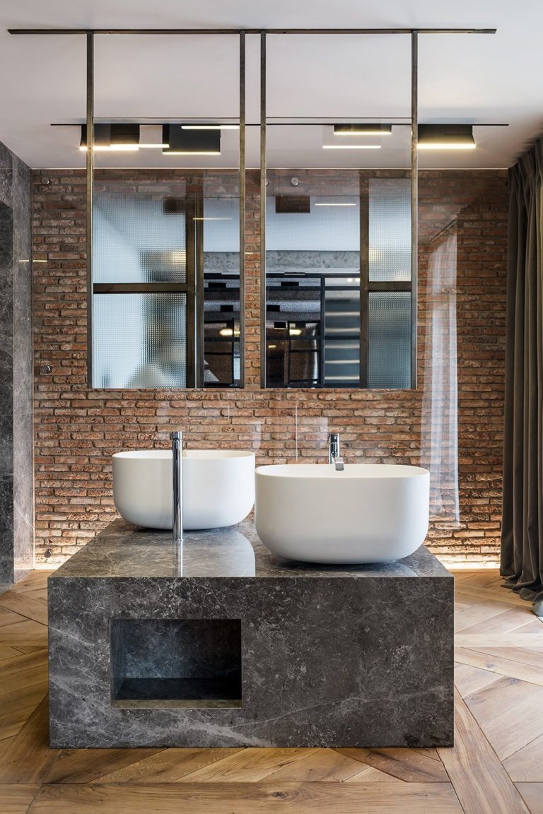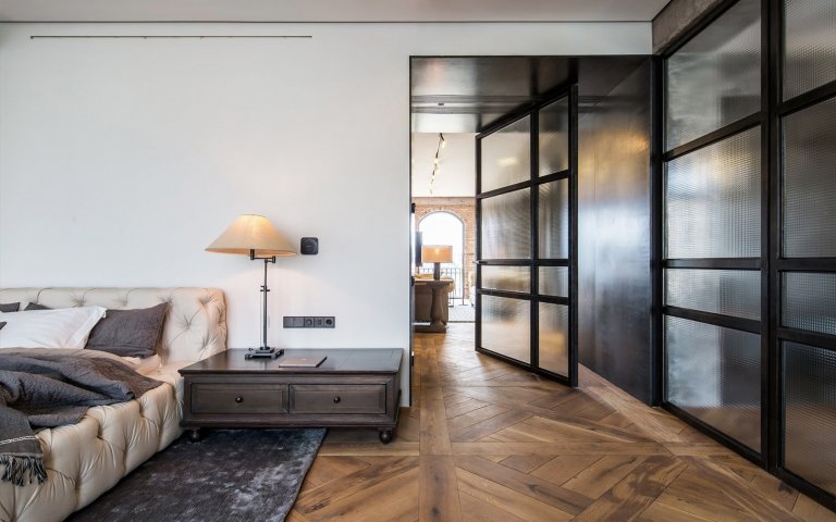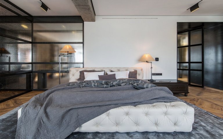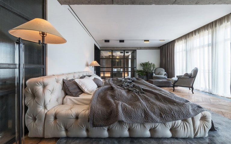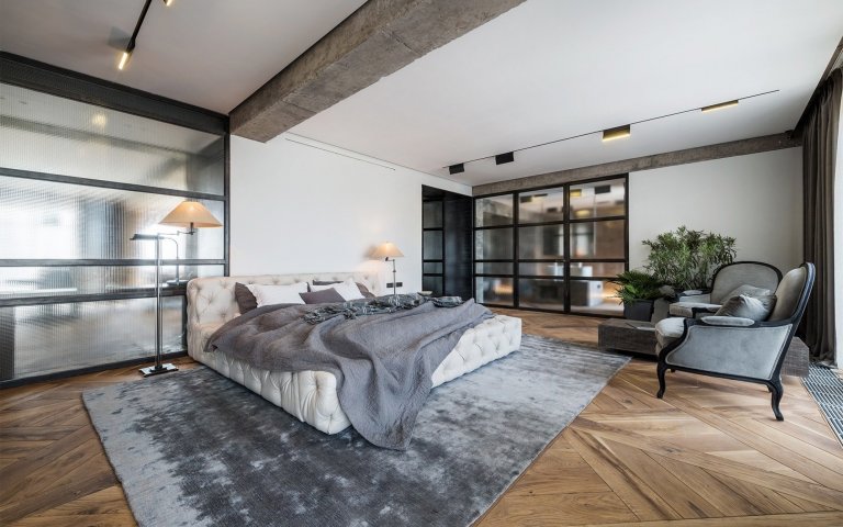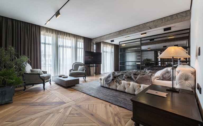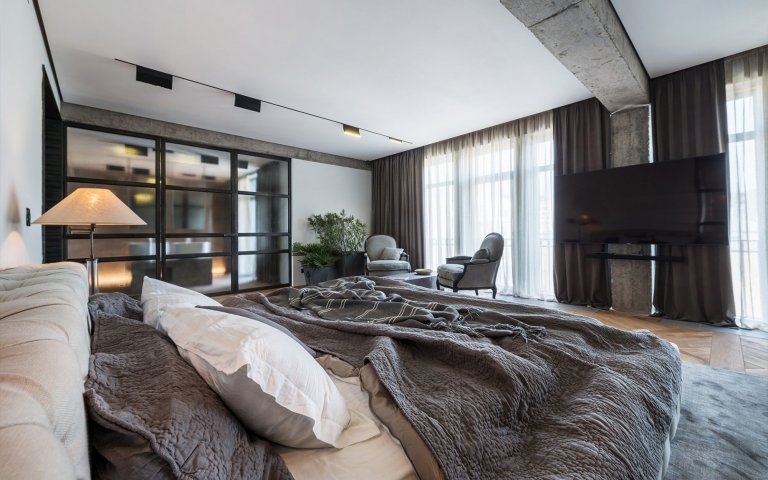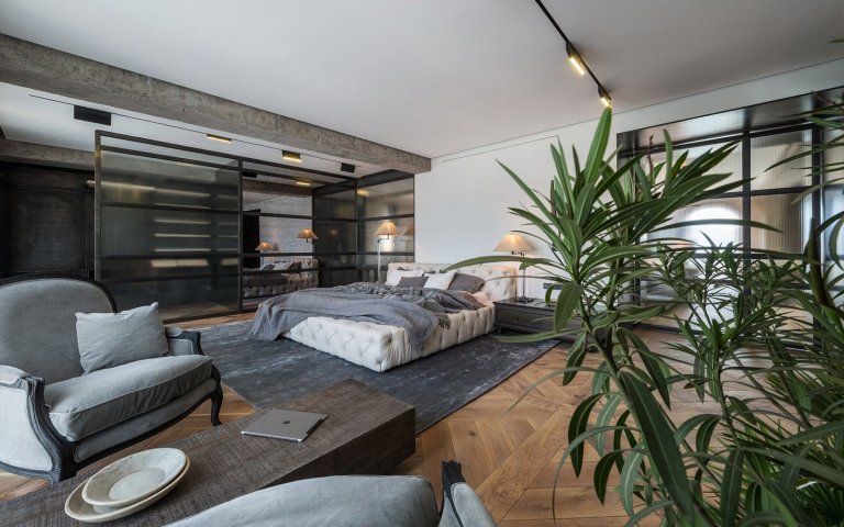 Otevřená koncepce umožňuje dostatečné osvětlení prostorů přirozeným světlem, což je vždycky velké plus. Okna v apartmánu sahají od stropu až k podlaze, od jedné stěny ke druhé. Ve společenských prostorech je využito atraktivních materiálů – od dubových podlah až po rustikální nábytek, kovové a betonové povrhy, jež jsou skvěle začleněny mezi ostatní materiál. Soukromé prostory jsou zosobněním pohodlí, funkčnosti a pohody.
