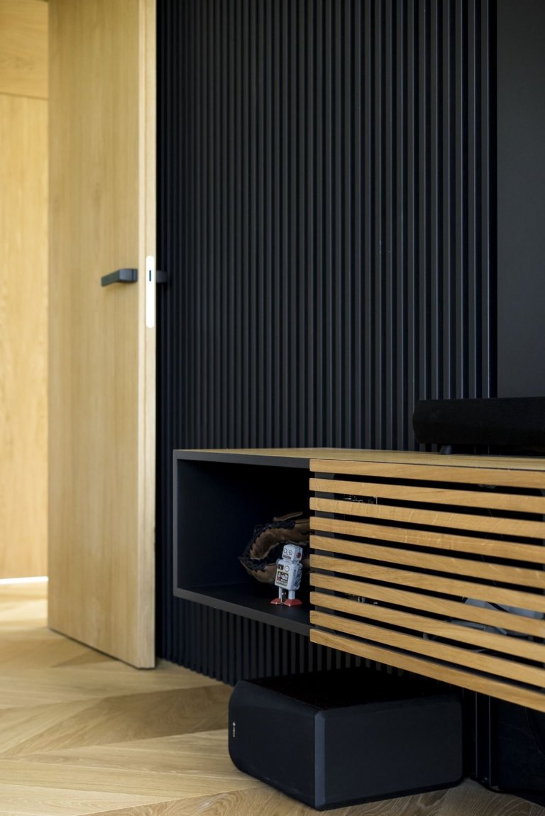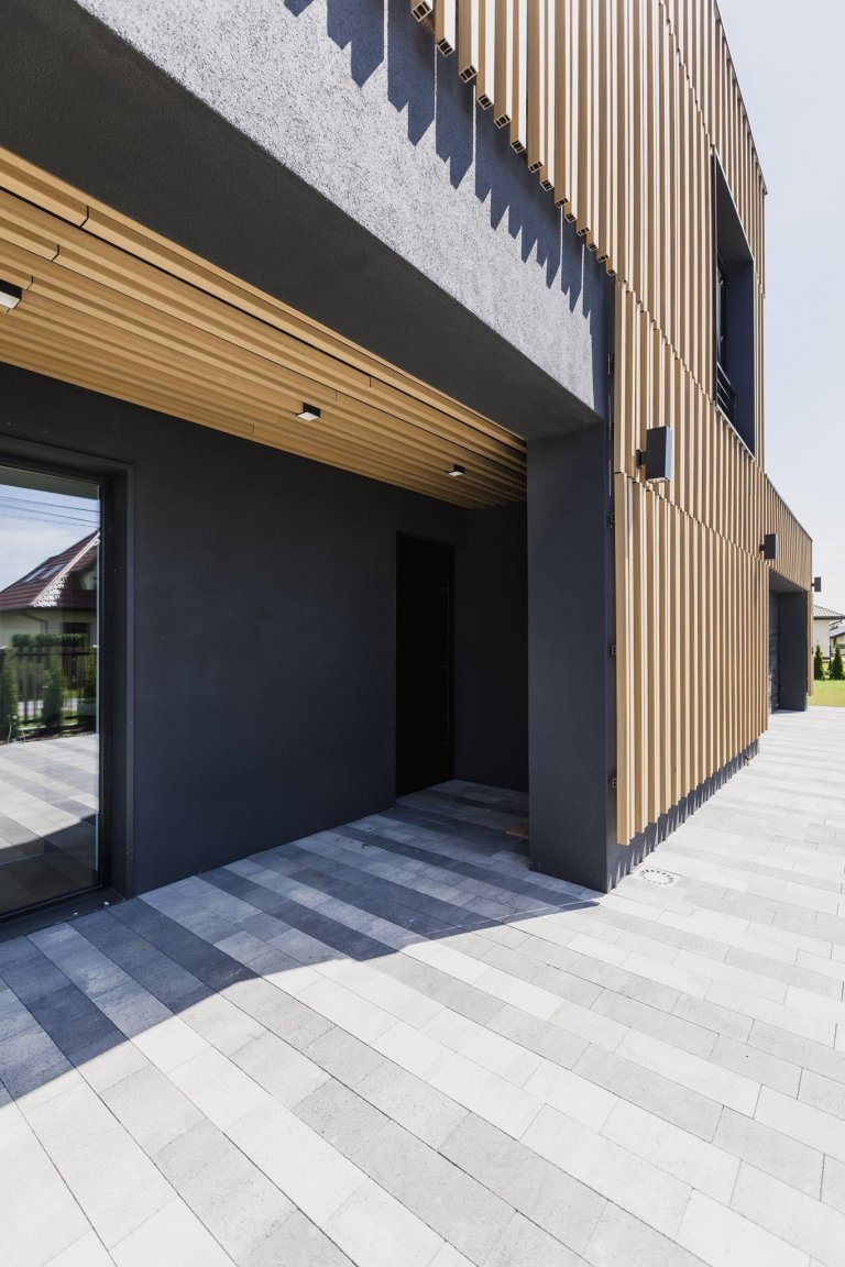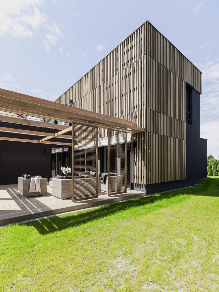 Dům se nachází v ochranném pásmu přírodní krajiny. Blízkost přírody přiměla návrháře k vytvoření geometrického a pevného materiálu, použitého současně se dřevem. Tělo budovy je tvořeno dvěma protínajícími se kostkami. Obytná část domu se nachází ve větší, garáž s posilovnou v menší. Jedním z nejdůležitějších aspektů bylo co nejlepší osvětlení budovy, což se povedlo díky dobře umístěným oknům.. Fasáda byla pokryta černým nátěrem s chladnými pigmenty a opatřena ochranou proti biologické korozi. Speciálním způsobem, který firma Metaforma použila, je použití otevřeného kompozitního trámového systému pro černé lakované vertikální lišty a černé příčné nosníky. Dřevotřískový kompozit, který byl vybrán místo přírodních materiálů, nevyžaduje další impregnaci. To vše vytváří zajímavý trojrozměrný efekt. Tmavé detaily ve formě kovových okenních krytin a zábradlí důsledně doplňují koncept celé stavby.